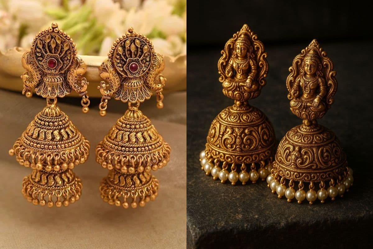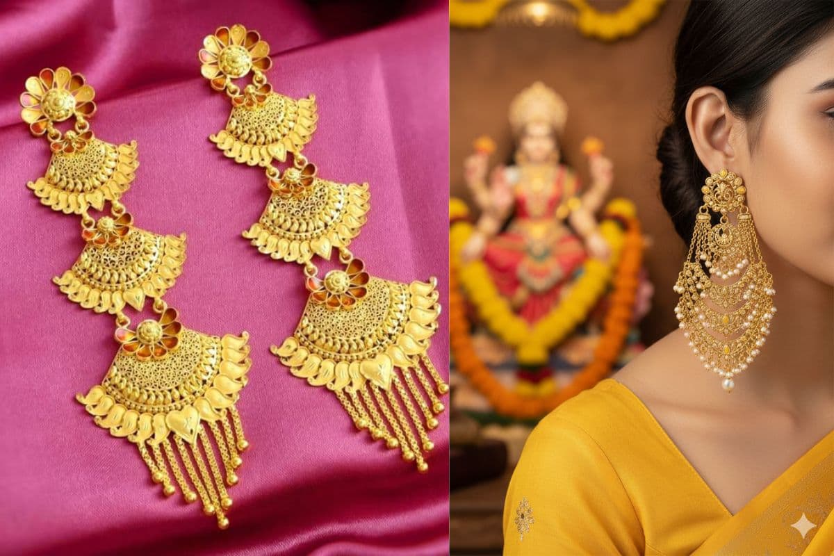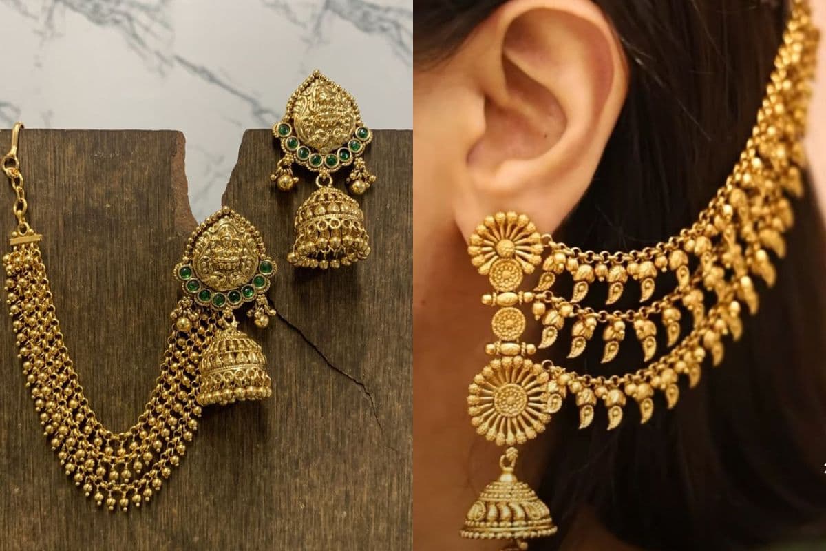 मल्टी-लेयर चैन झाला (Multi-layer Chain Jhalla) : यह डिजाइन आजकल सबसे ज्यादा डिमांड में है. इसमें मुख्य झुमके या झाला के साथ सोने की बारीक चैन होती हैं जो बालों तक जाकर पिनअप होती हैं. यह साड़ी पर बहुत ही भारी और रॉयल लुक देता है.