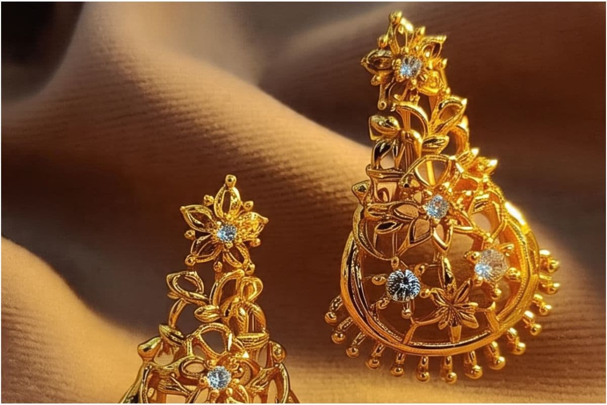 झूमर स्टाइल गोल्ड झुमके : बड़े और लेयर्ड झुमके जो भारी लुक देते हैं. दुल्हन या वेडिंग फंक्शन के लिए परफेक्ट चॉइस है.