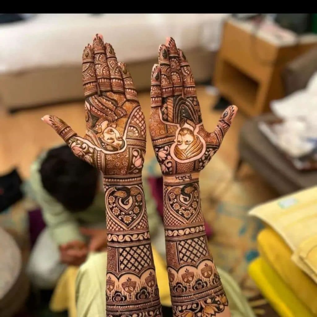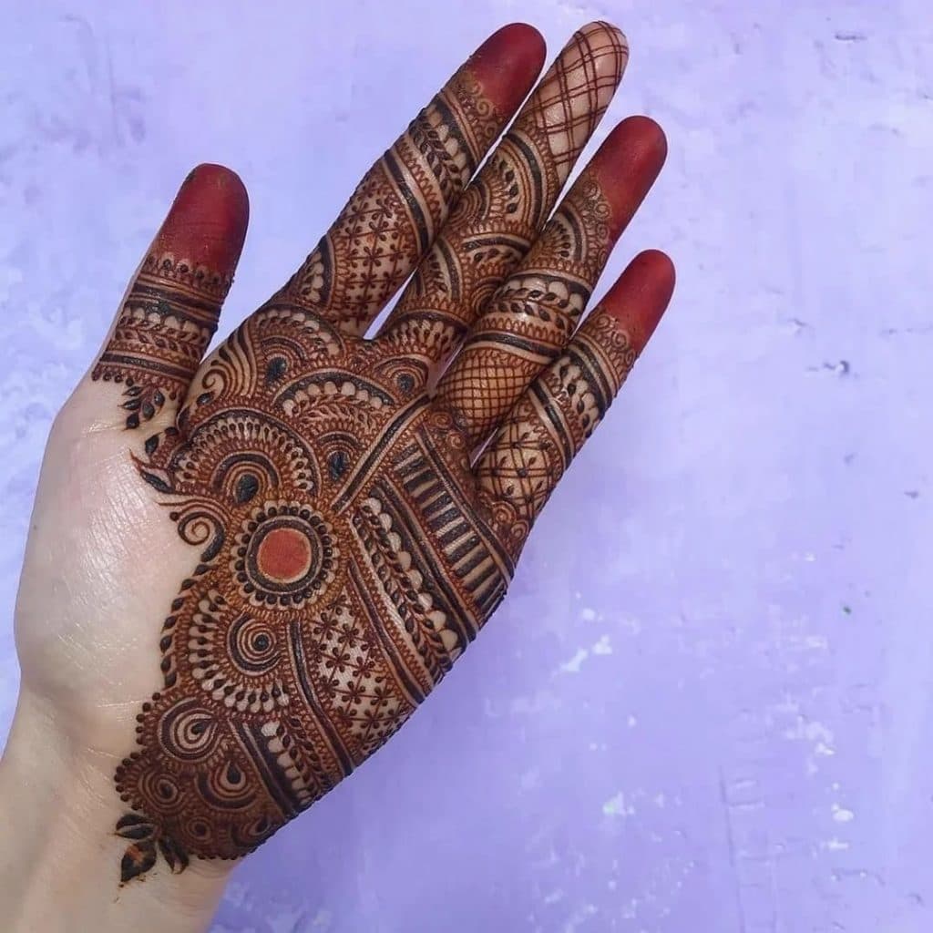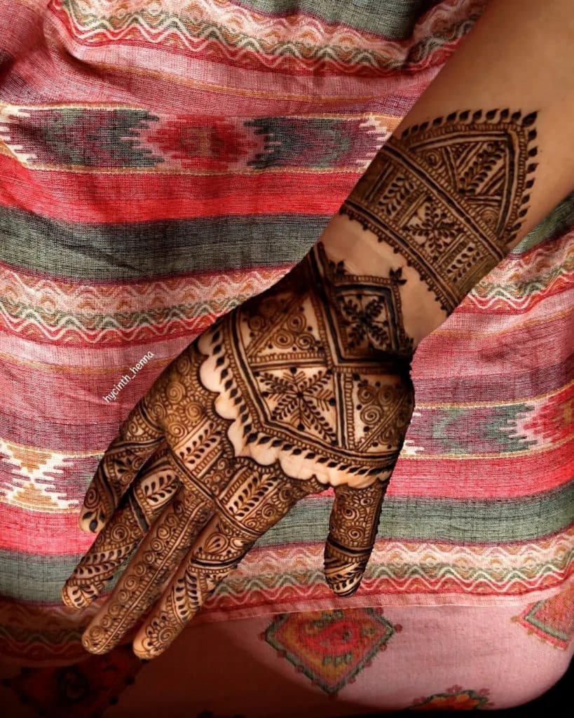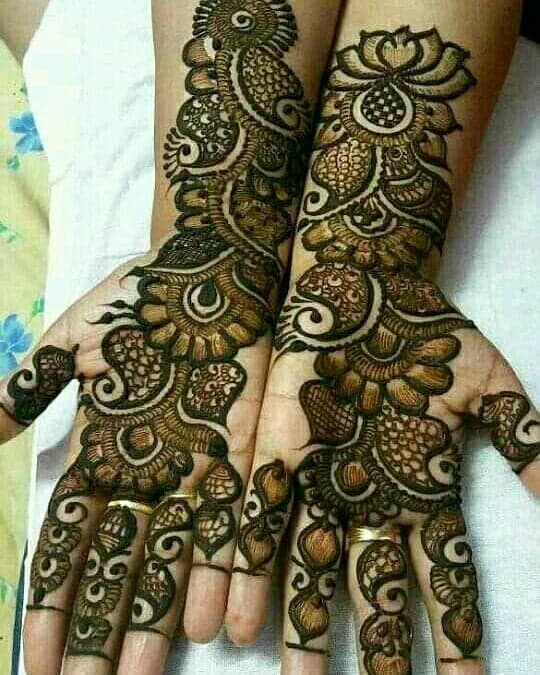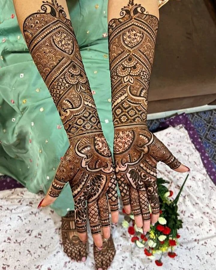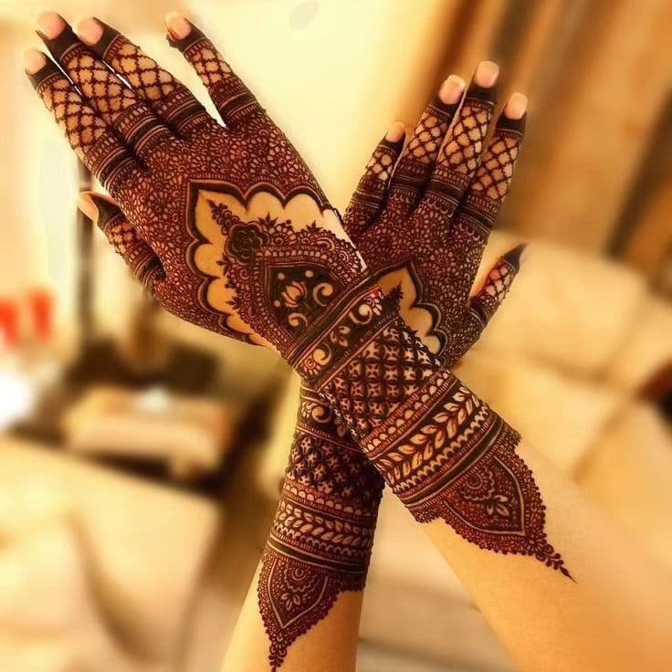 इसमें काफी गूढ़ कलाकारी की जाती है और मोर, फूल एवं घुमावदार कर्वस से डिजाइन बनायी जाती है. इसमें बीच में ज्यादा जगह नहीं छोड़ी जाती. इस डिजाइन को ज्यादातर महीन रेखाओं में बनाया जाता है, जिसमें हाथों को उंगलियों के सिरे से लेकर कोहनियों तक एवं पैरों को अंगूठे से घुटनों तक लगाया जाता है.