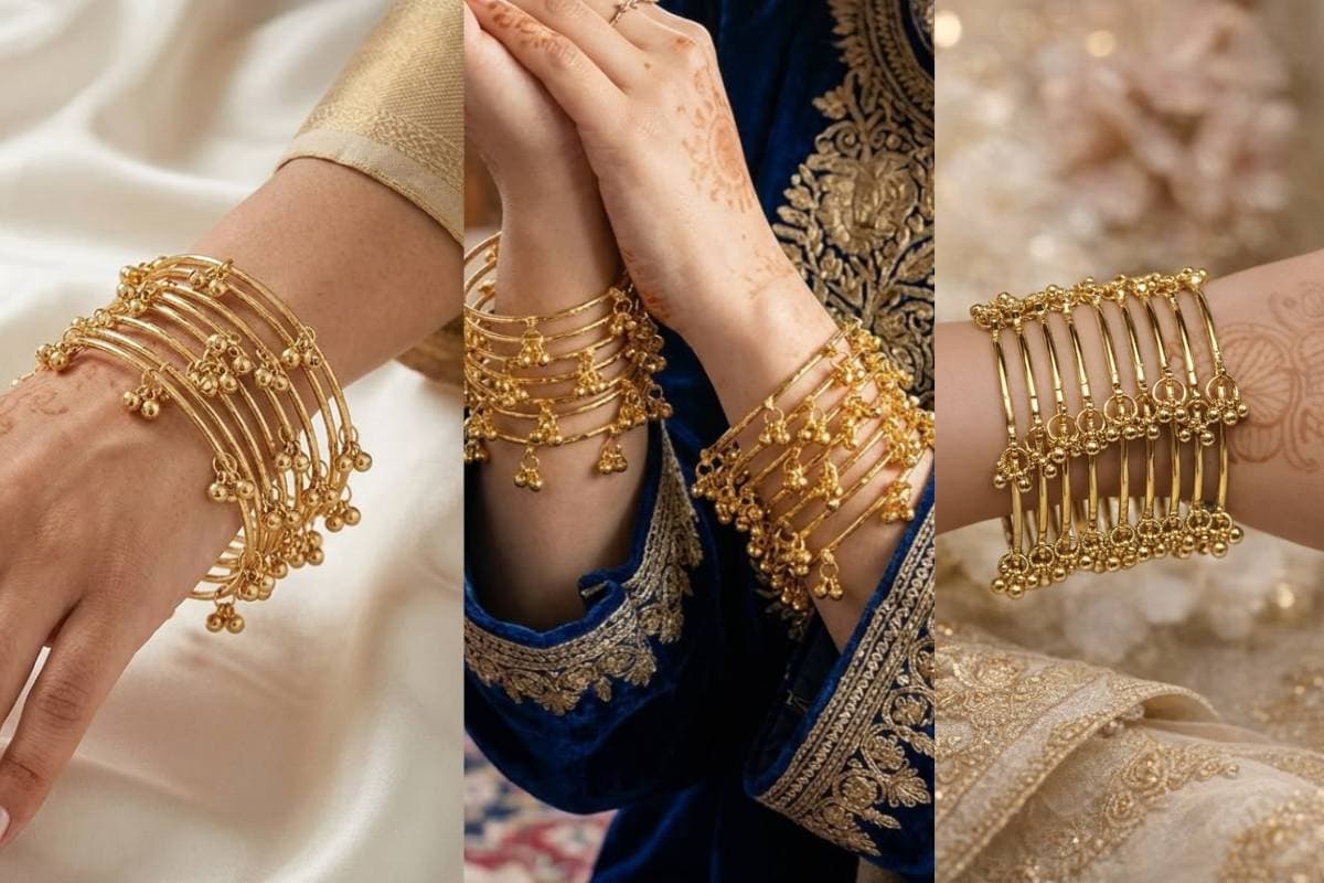 ये कंगन मेटल बेस पर बने होते हैं जिन पर घुंघरू, पर्ल, कुंदन और स्टोन वर्क होता है. ये कांच के कंगनों से ज्यादा मजबूत होते हैं और इंडो-वेस्टर्न ड्रेस के साथ भी बहुत अच्छे लगते हैं. मिनिमल और फ्यूजन ज्वेलरी लुक के लिए ये बेस्ट होते हैं.