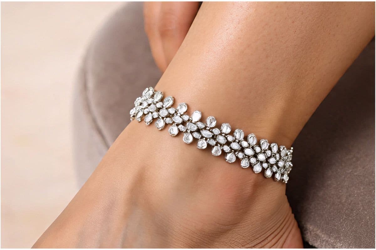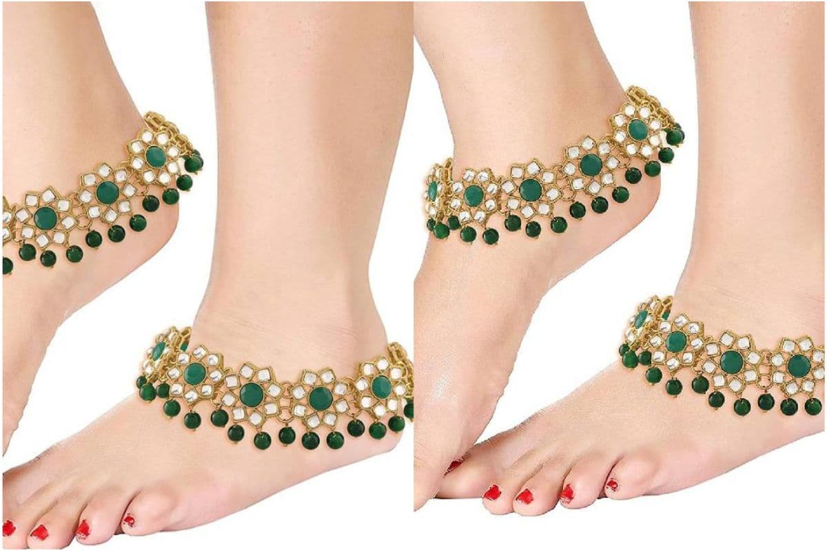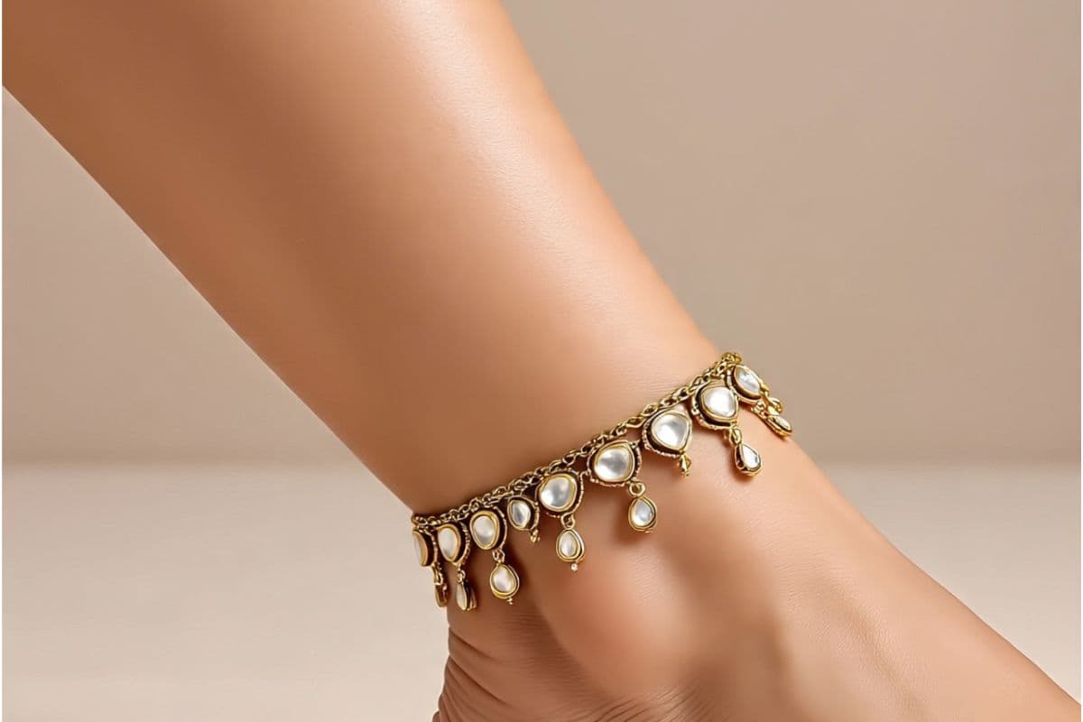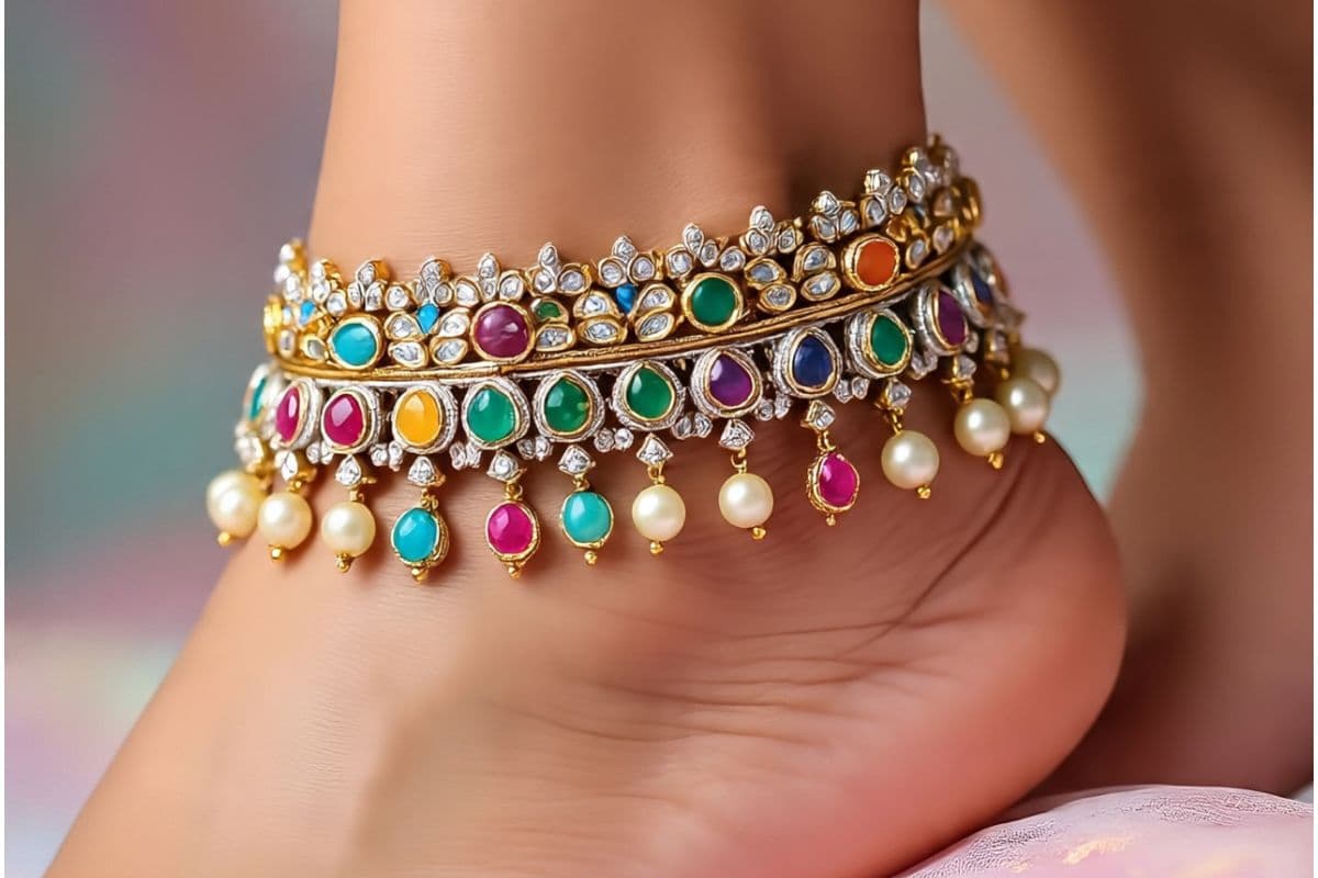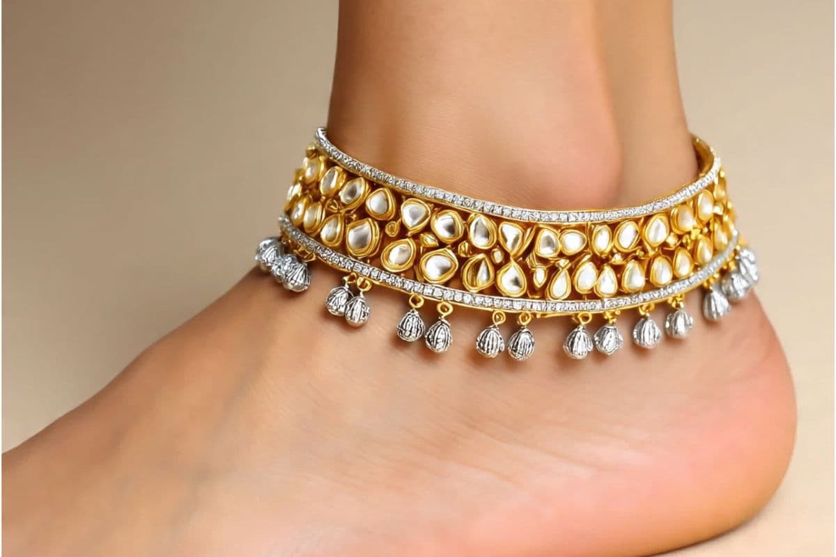 जड़ाऊ कुंदन पायल : अगर आप एक स्टेटमेंट पीस चाहते हैं तो जड़ाऊ कुंदन पायल बेहतरीन हैं. ये चौड़ी होती हैं और पूरी तरह से कुंदन, मोतियों और रंगीन रत्नों से जड़ी होती हैं. इनमें जटिल पैटर्न और भारी काम होता है जो शाही परिवार के गहनों की याद दिलाता है.