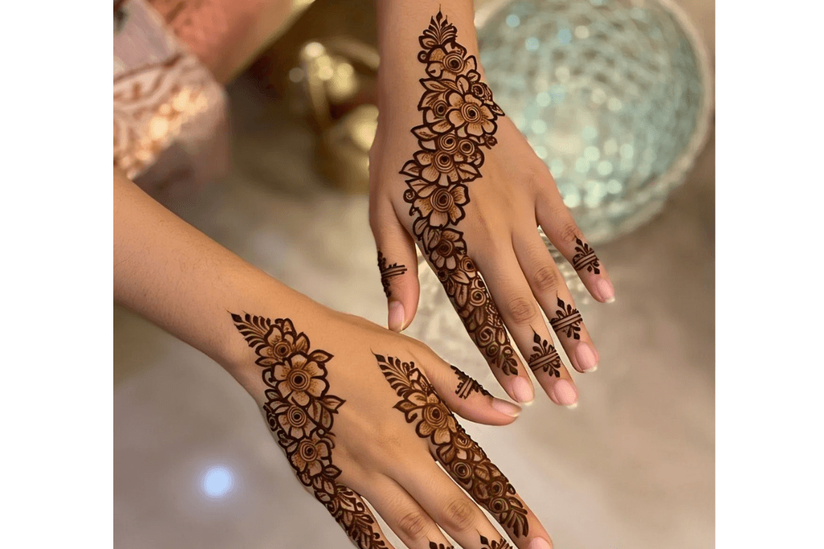 आप इस तरह के खूबसूरत फूलों के डिजाइन वाली मेहंदी से अपने हाथों को निखार सकते हैं. ऐसे मिनिमल वेस्टर्न डिजाइन की मेहंदी आजकल ट्रेंड में चल रहे हैं.