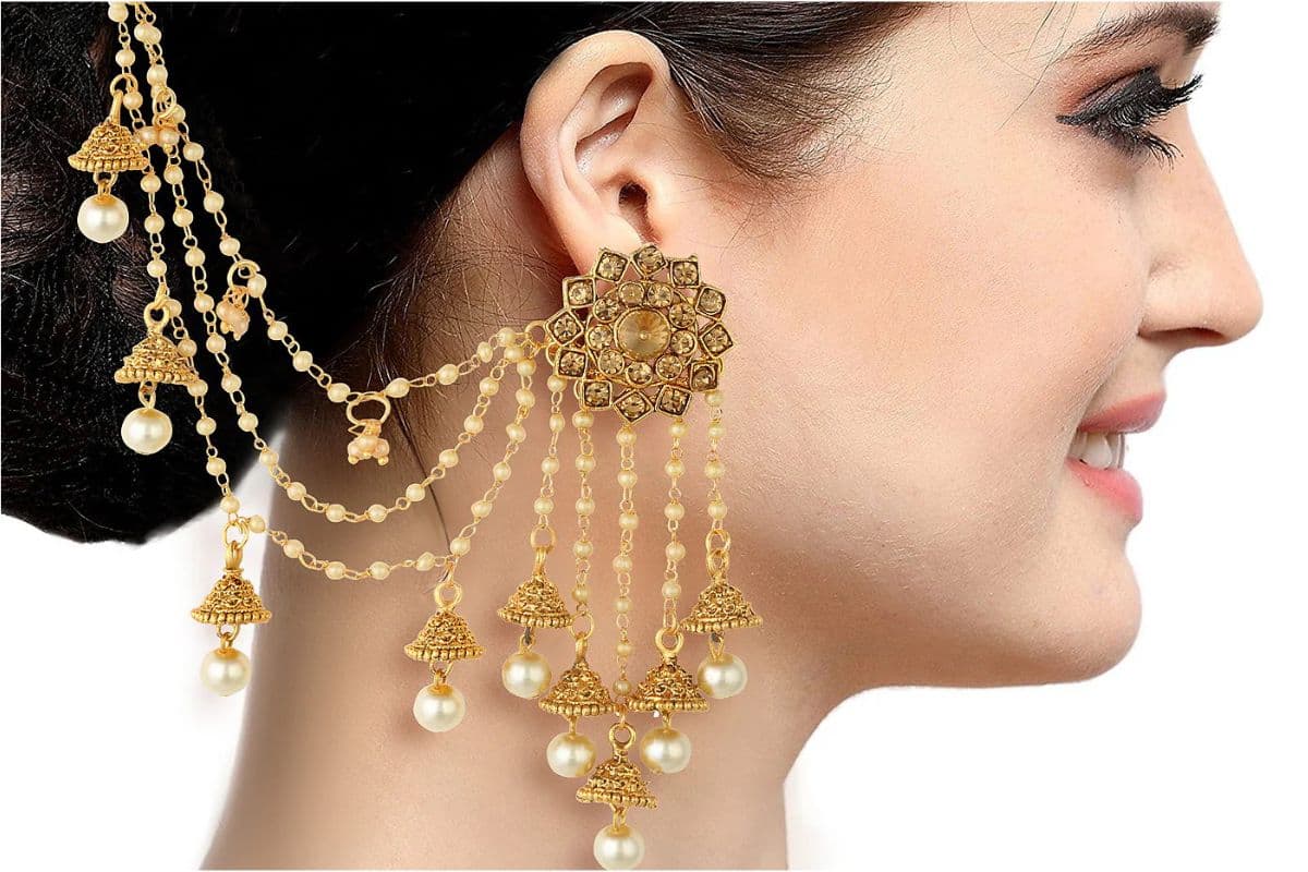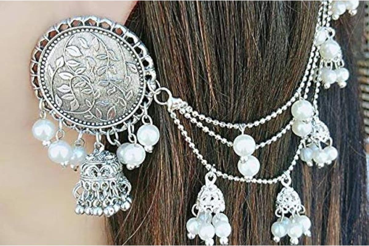 सिंपल चेन अटैचमेंट: इसमें एक पतली चांदी की चेन झुमके के ऊपरी हिस्से से जुड़ी होती है और इसे बालों में क्लिप या हुक किया जाता है.यह डिजाइन रोजमर्रा के पहनने या छोटे आयोजनों के लिए अच्छा है.