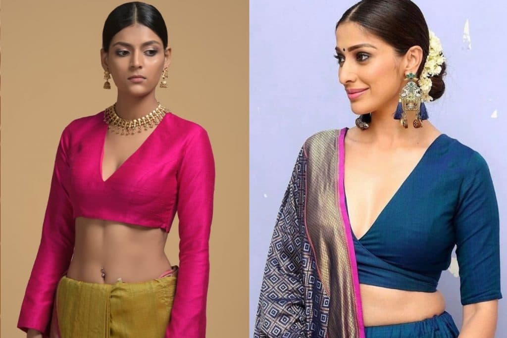 आज-कल वी नेक ब्लाउज बहुत ट्रेंड में है. छोटी गर्दन वाली महिलाओं पर यह डिजाइन बेहद सुंदर लगता है. इस तरह के ब्लाउज का गले का आकार वी शेप में होता है.
