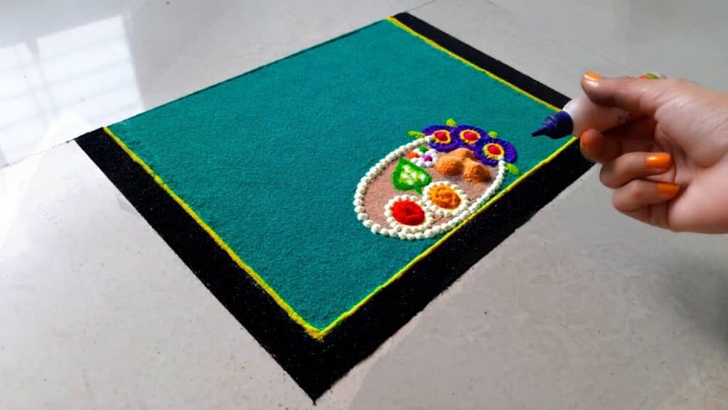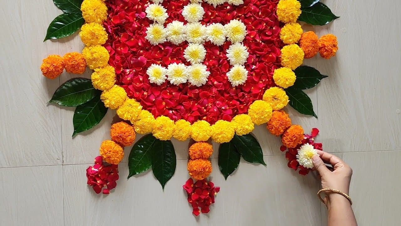 फूलों की रंगोली मकर संक्रांति के त्योहार पर एक प्यारी और सरल सजावट है, आप विभिन्न रंगों के फूलों की आकृतियां बना सकते हैं, जैसे कमल, सूरजमुखी या गुलाब, इन फूलों के माध्यम से आप घर में ताजगी और सकारात्मक ऊर्जा का संचार कर सकते हैं, इसके लिए गुलाबी, बैंगनी, और पीले रंग का इस्तेमाल करें.