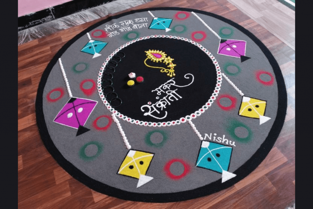 मकर संक्रांति पर पतंगबाजी का जोश और उत्साह देखते ही बनता है. आप रंगोली में रंग-बिरंगी पतंगों के डिजाइन्स बनाकर त्योहार की थीम को खूबसूरती से दर्शा सकते हैं.
