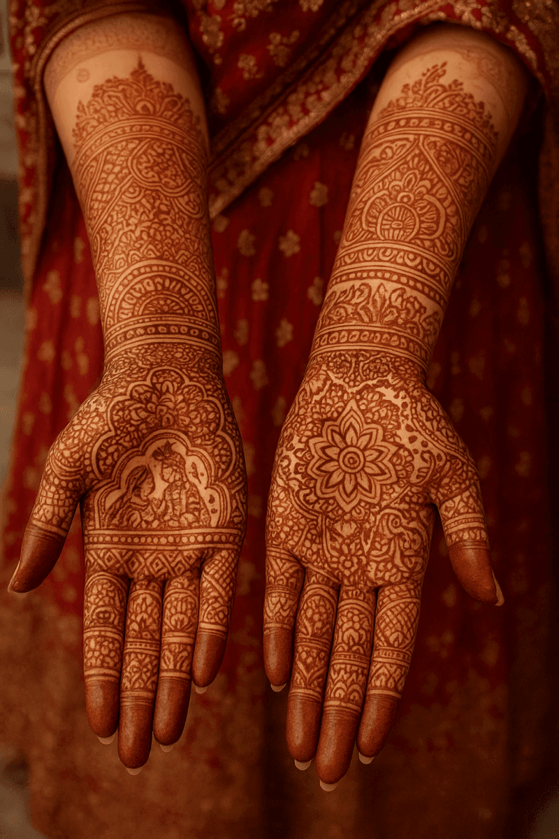 परंपरा का सबसे खूबसूरत रूप राजस्थानी मेहंदी में देखने को मिलता है. इसमें हाथों पर दुल्हा-दुल्हन की झांकी, राजस्थानी लोक आकृतियां, मोर, हाथी और दर्पण नुमा पैटर्न शामिल होते हैं. इसका फाइन वर्क और डीप डाई हाथों को रॉयल लुक देता है. ऐसा नहीं है कि ये डिजाइन सिर्फ दुल्हन के लिए होता है. ये डिजाइन ऐसा है कि ये हर लोगों के हाथों में जंचता है. खास बात यह है कि फुल कवर डिजाइन फोटो क्लिक में सबसे आकर्षक दिखाई देता है.