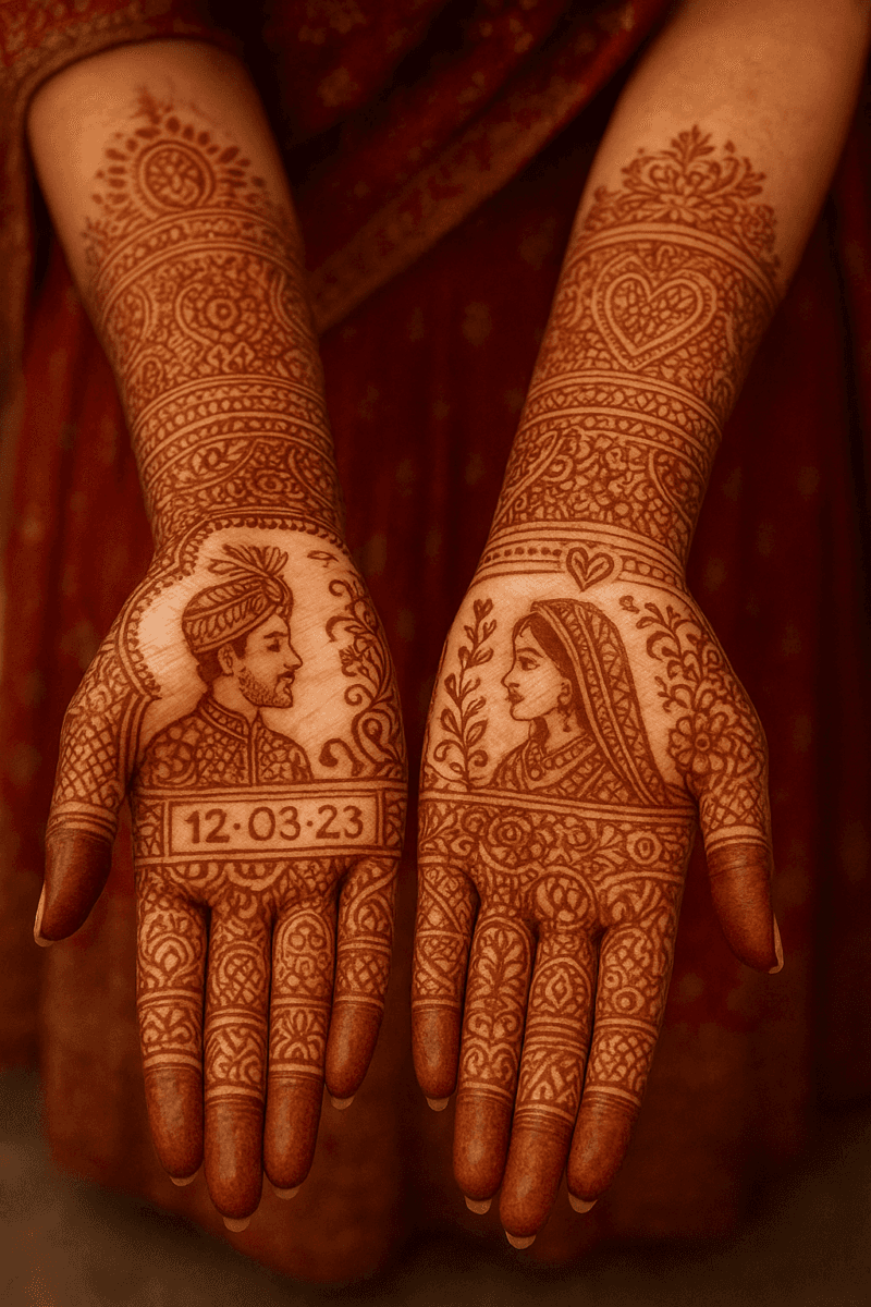 आज की लड़कियां अपनी मेहंदी में यूनिक टच चाहती हैं. इसमें दूल्हा-दुल्हन का नाम सबसे प्रमुख है. हालांकि ये खास तौर से नयी दुल्हन के लिए है लेकिन अब अन्य महिलाएं या लड़कियां भी इससे बननाती है. दूल्हा-दुल्हन के नाम के अलावा शादी की डेट, पहली मुलाकात का सीन, हॉबी, लोकेशन या रिश्ते की कोई खास बात डिजाइन में शामिल की जाती है. यह डिजाइन ग्लैमरस के साथ भावनाओं को भी जोड़े रखता है.