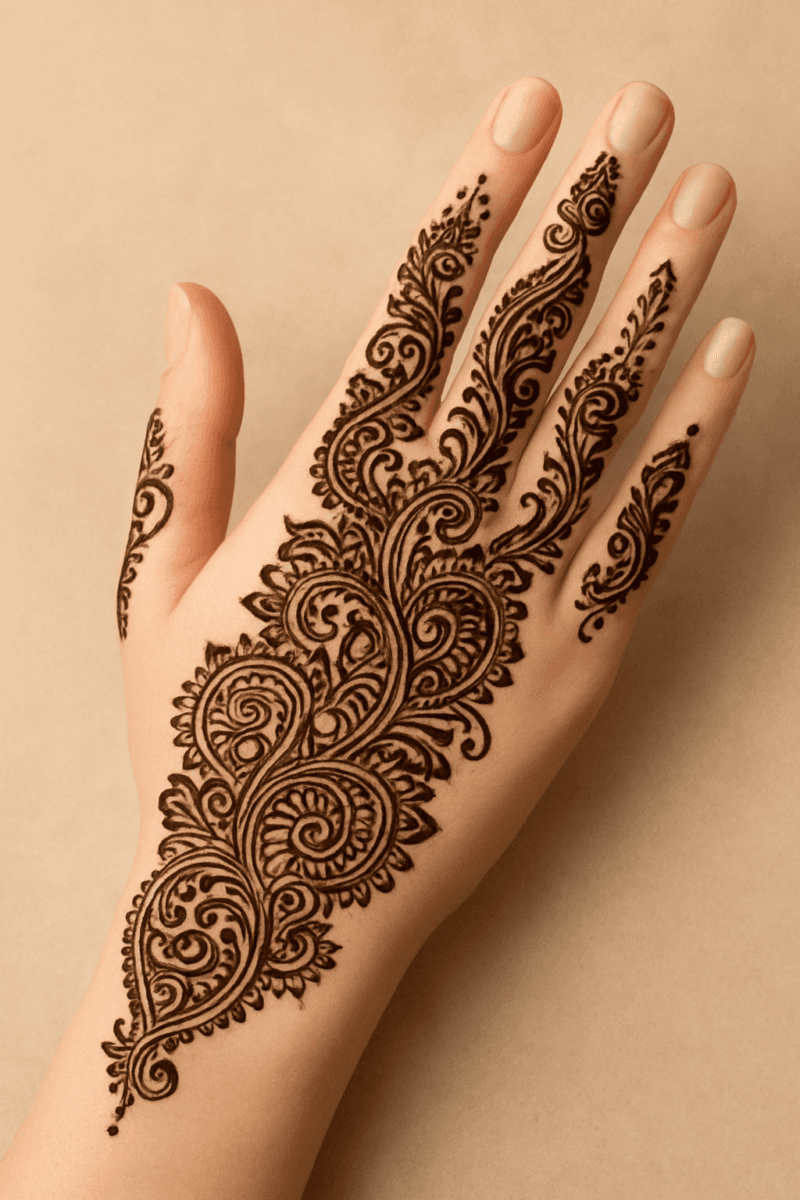 मिनिमल मोडर्न फिंगर मेहंदी डिजाइन उन दुल्हनों के लिए जिन्होंने भारी मेहंदी से दूरी बनाई है, सिर्फ फिंगर फोकस्ड मेहंदी ट्रेंड में छाई हुई है. उंगलियों पर फाइन लाइन आर्ट और ज्योमेट्रिक पैटर्न देकर बीच का हिस्सा खाली छोड़ा जाता है. सगाई और मेहंदी नाइट में यह डिजाइन सबसे ज्यादा पसंद किया जा रहा है.