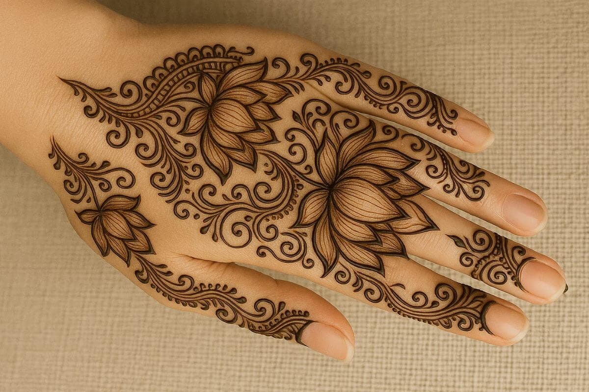 आप मेहंदी डिजाइन में लोटस थीम यानी कमल के फूल से डिजाइन बना सकते हैं. ये त्योहार और सावन के लुक को कंप्लीट करेगा.