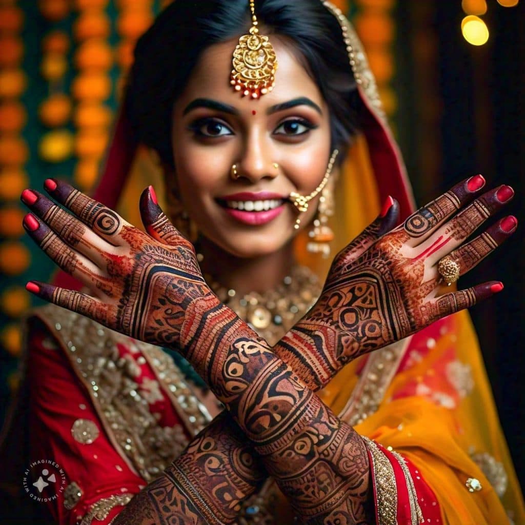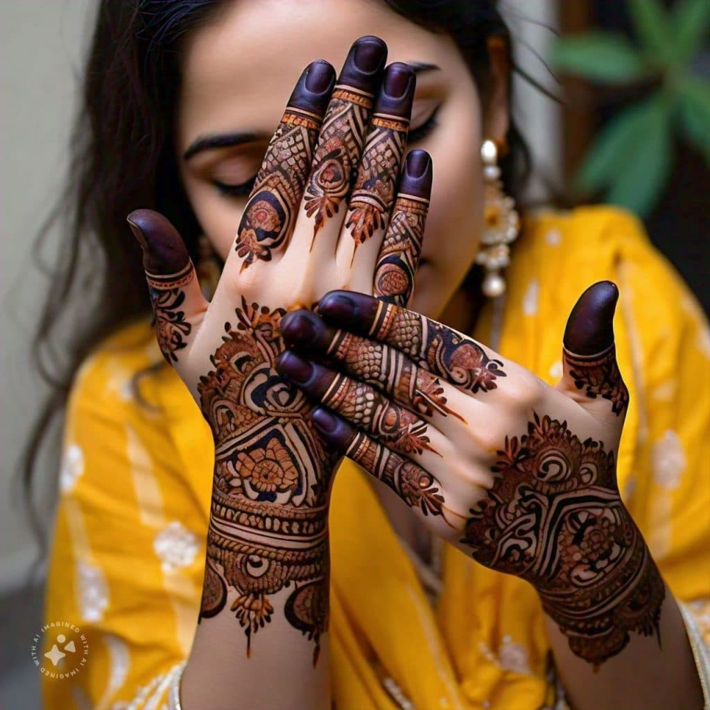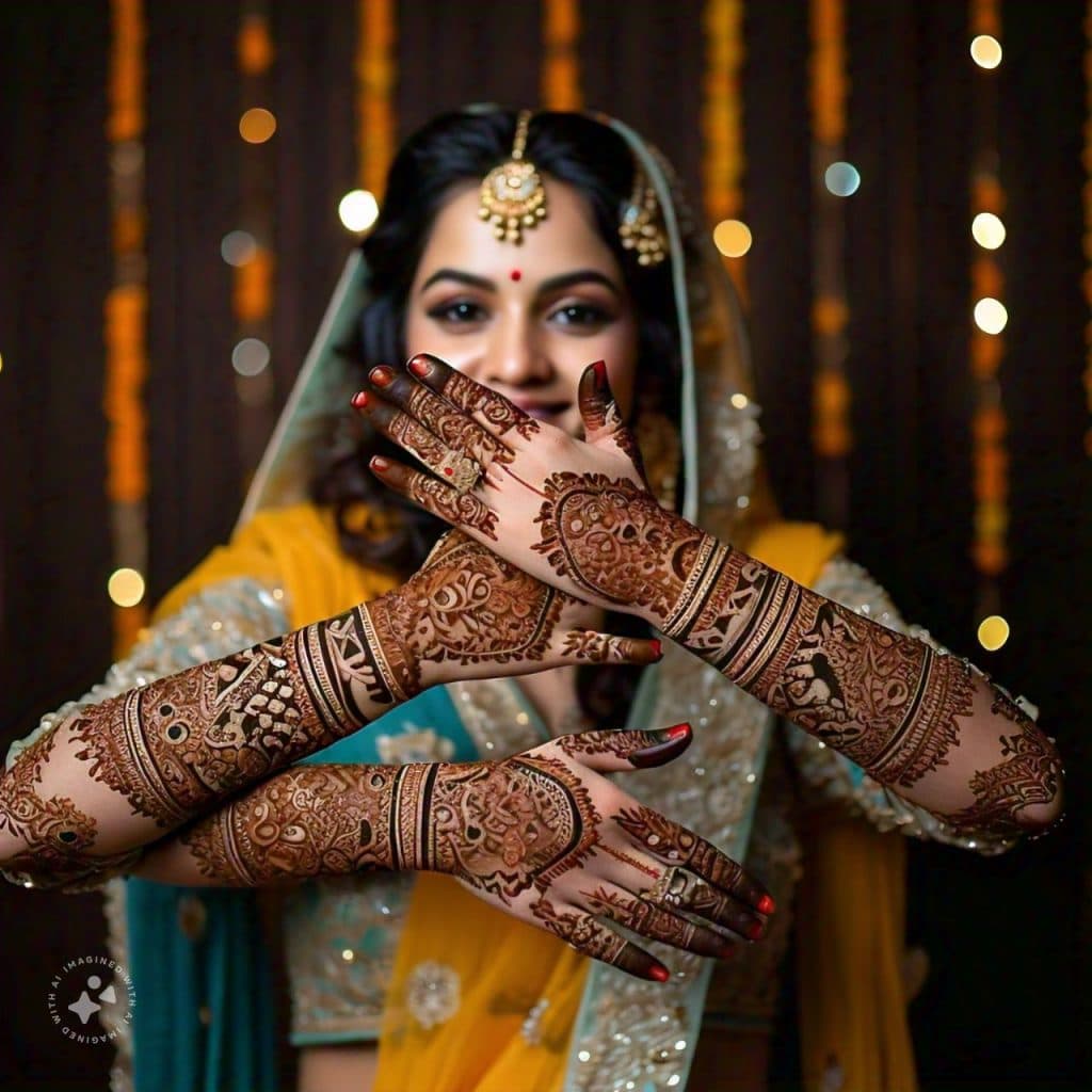 full hand mehndi design: आप इस तरीके से फोटो सूट करा सकते हैं, दोनों हाथों में मेहंदी की डिजाइन सामने हो, और आप अपनी मेहंदी को देख रही हों.