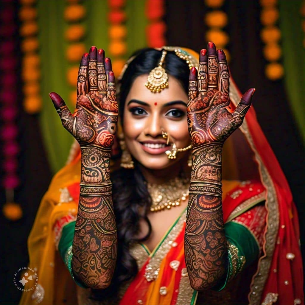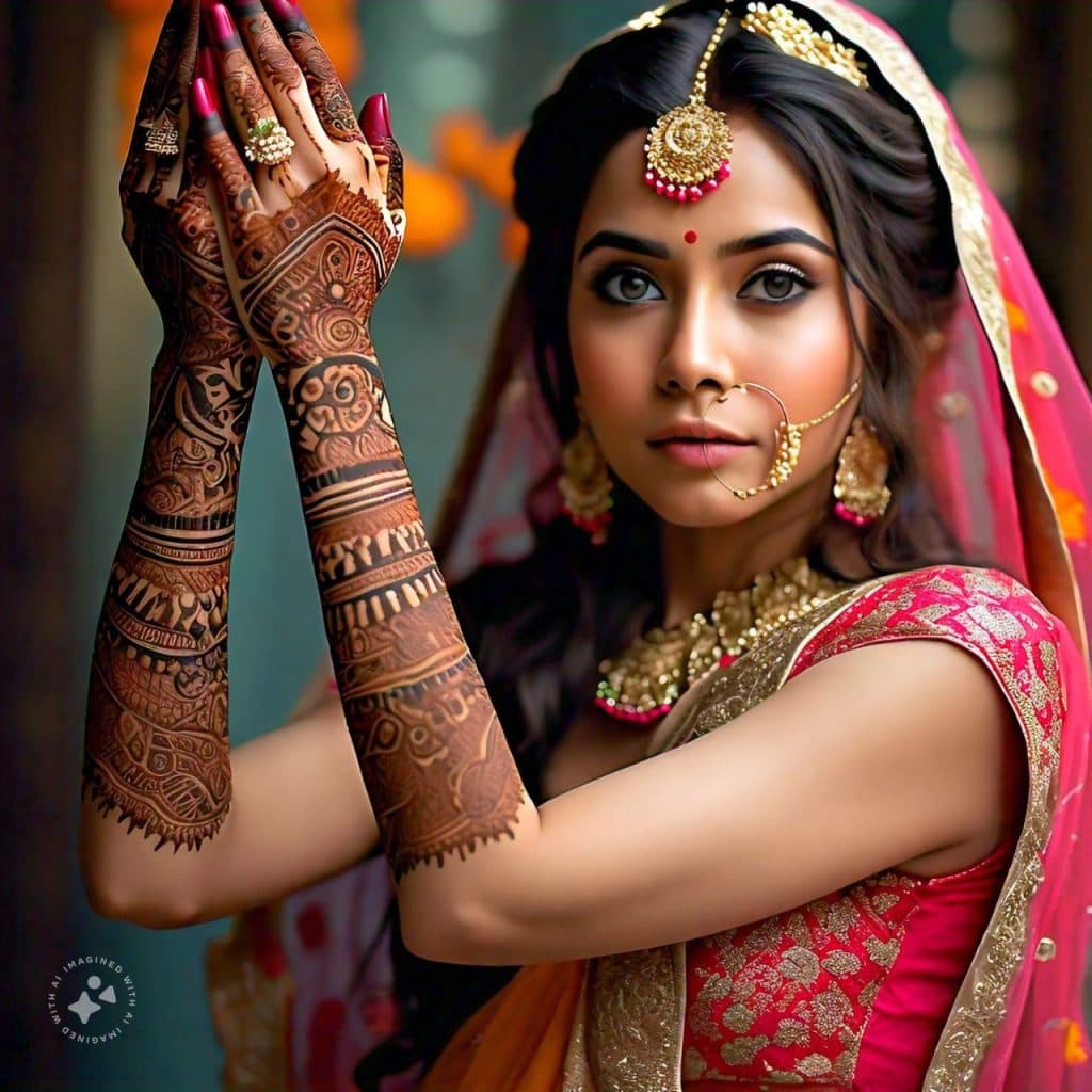 full hand mehndi design: बेहद खास और कॉमन है इस पोज में मेहंदी के साथ ली गई तस्वीर. आप इस पोज को भी ट्राई कर सकती हैं.