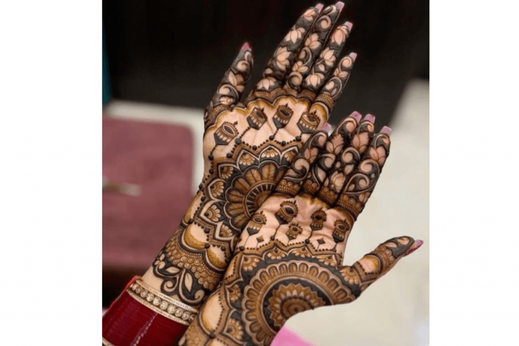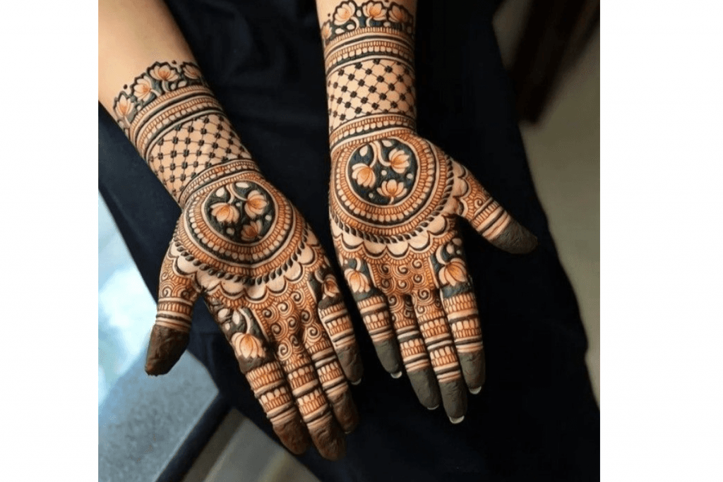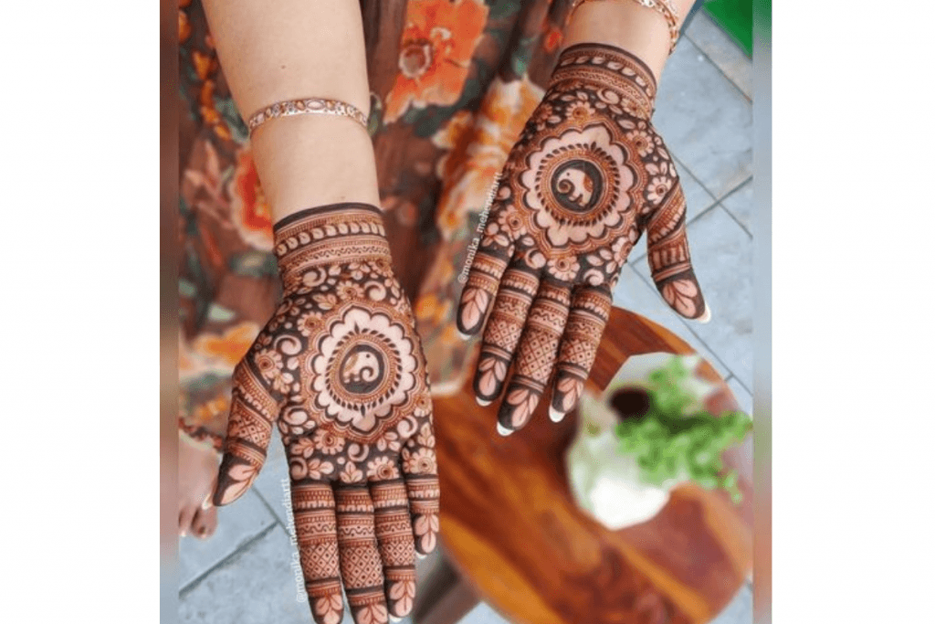 यह पारंपरिक डिजाइन है जिसमें हाथों के बीच में गोल टिक्की बनाई जाती है और उसके चारों ओर सुंदर पैटर्न जोड़े जाते हैं.