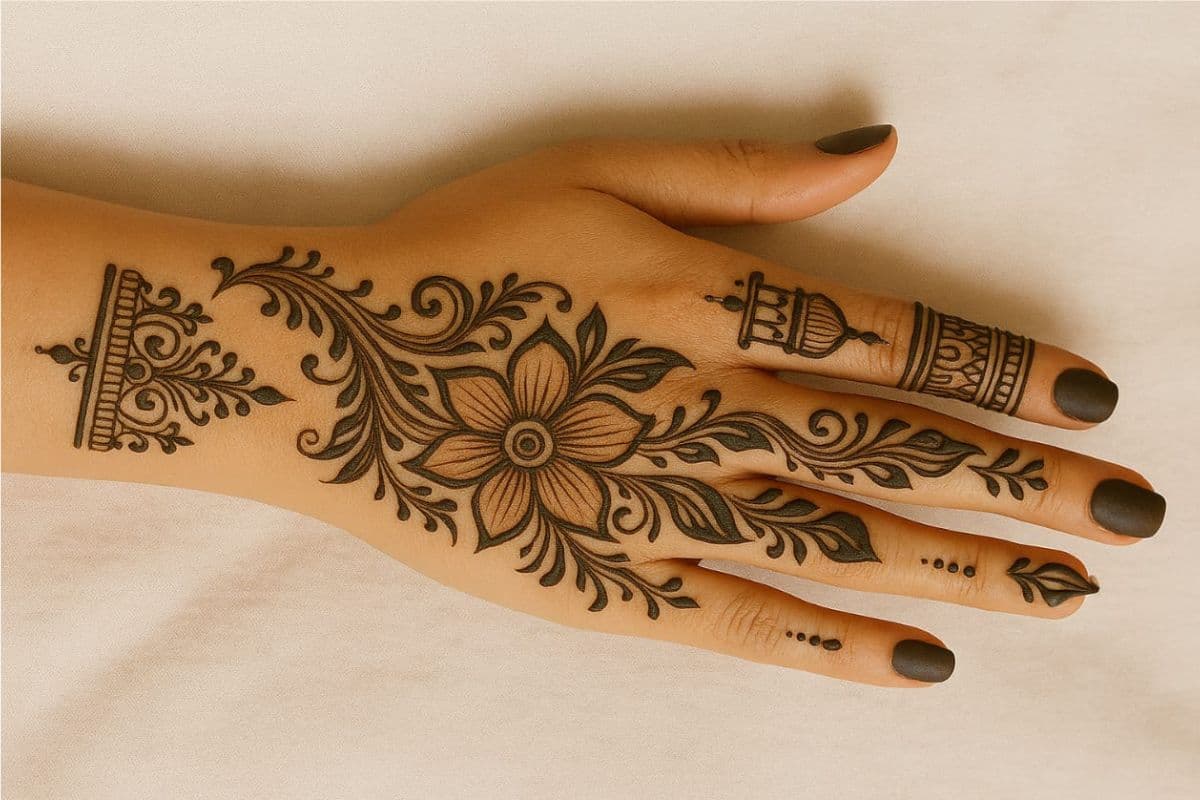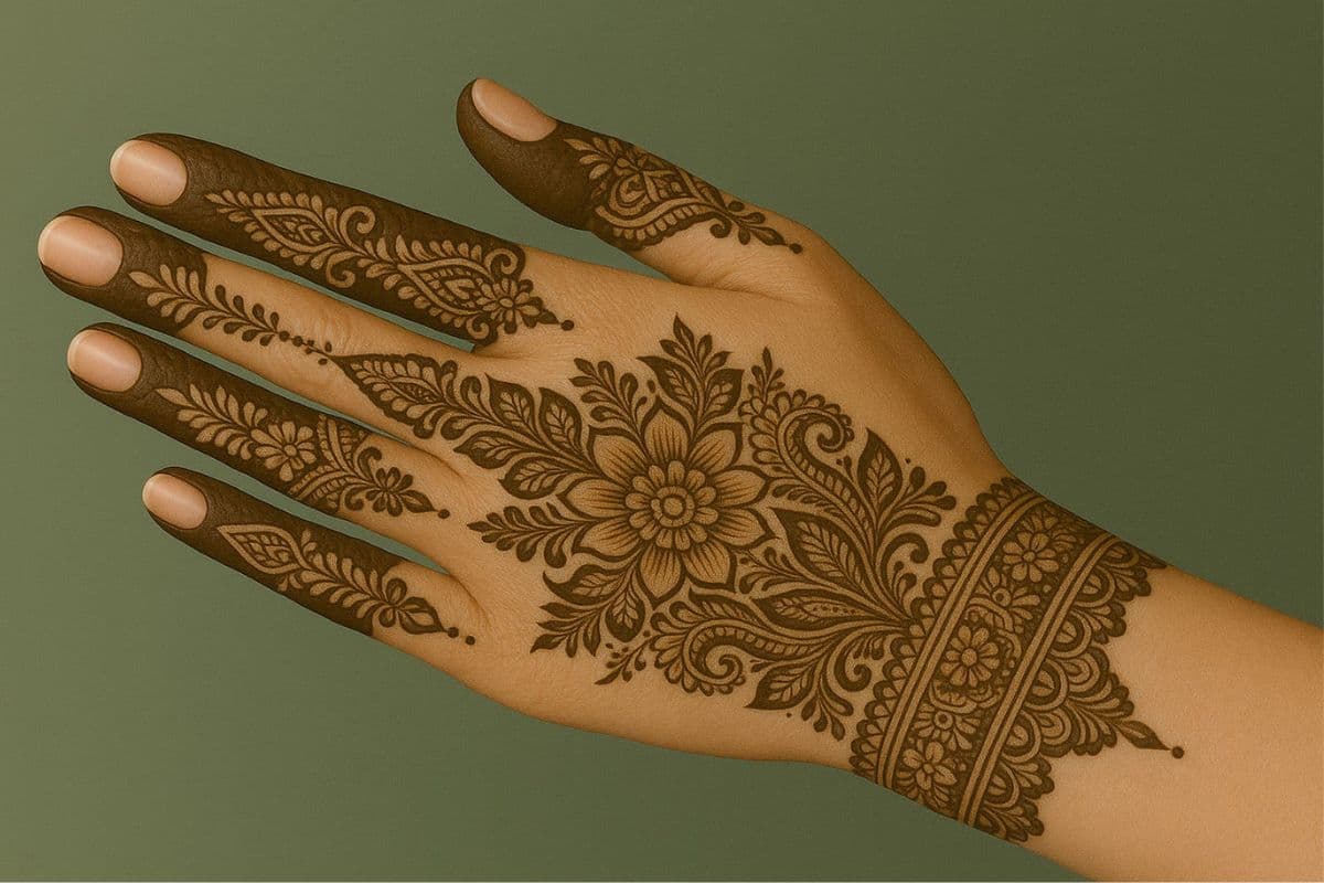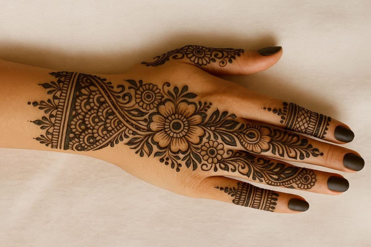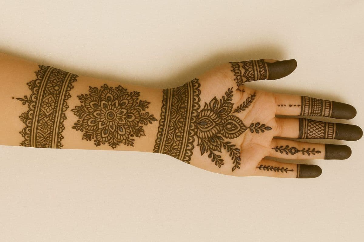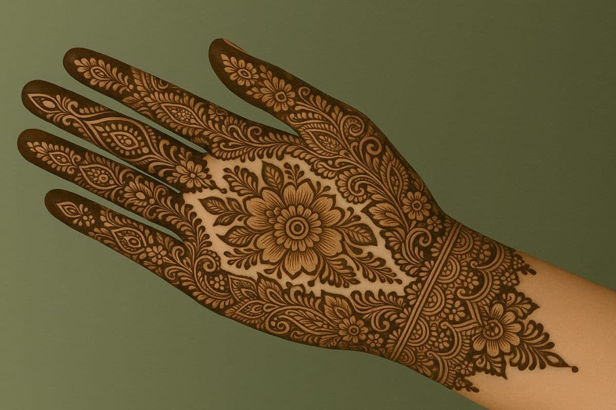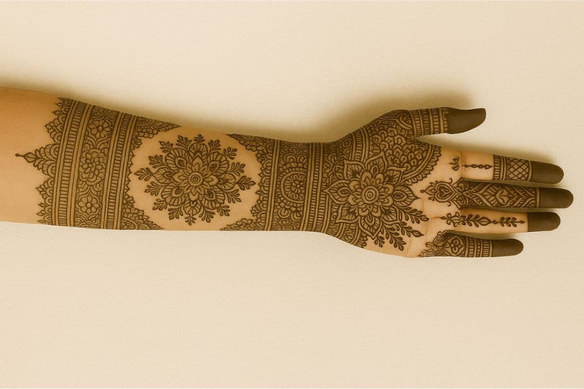 ये फुल हैंड मेहंदी डिजाइन आपके हाथों की खूबसूरती और भी बढ़ा देगी. इसमें छोटे पैटर्न, फूल-पत्तियां और सांस्कृतिक प्रतीक होते हैं, जो खास मौकों पर बेहद खास दिखते हैं.