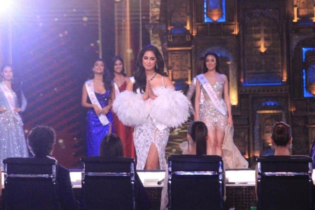 उनका पहला पहनावा सफेद रंग का था और इसमें कोई गलती नहीं है कि रिनी एक ब्यूटी क्वीन के तरह नजर आ रही थी. यह सिक्विन वर्क वाला एक चमकदार सफेद गाउन था जिसमें वह किसी परी से कम नहीं लग रही थी. इसके साथ उन्होनें सफेद रंग का एक केप पहना था.