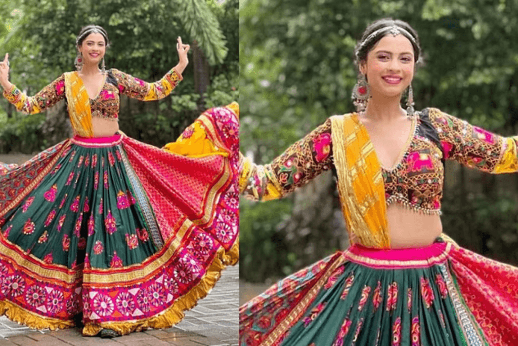 गरबा नाइट का रंग-बिरंगा माहौल नितांशी गोयल के कलरफुल वी-नेक ब्लाउज से बढ़ सकता है. यह डिज़ाइन ट्रेडिशनल लुक के साथ-साथ कम्फर्ट भी प्रदान करता है. आप इस ब्लाउज को किसी फुल फ्लेयर लहंगे के साथ पहन सकती हैं, जिससे आपका लुक और भी आकर्षक बनेगा. इस तरह के ब्लाउज से आपको गरबा में अपनी हर मूवमेंट में आराम मिलेगा.