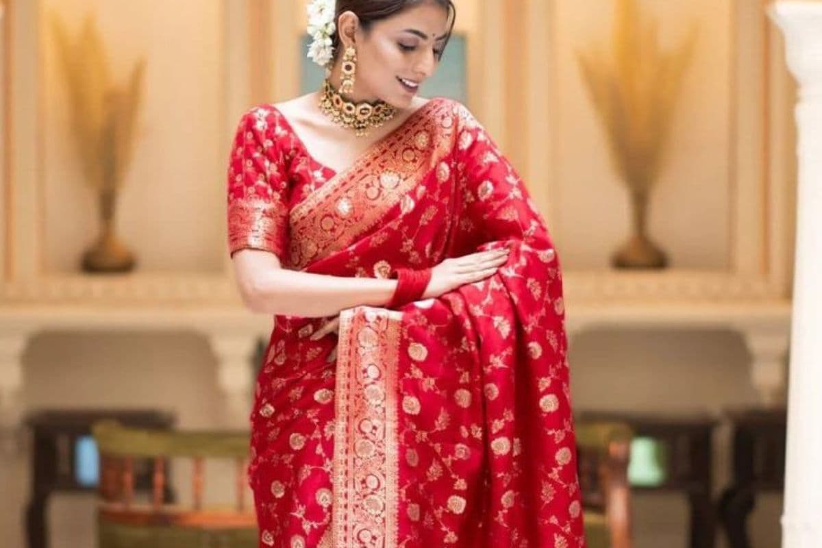 रेड कांजीवरम साड़ी :अगर आप साउथ इंडियन टच चाहती हैं तो कांजीवरम रेड साड़ी सबसे अलग लुक देगी. ब्राइडल और फेस्टिव दोनों के लिए बेस्ट चॉइस है.