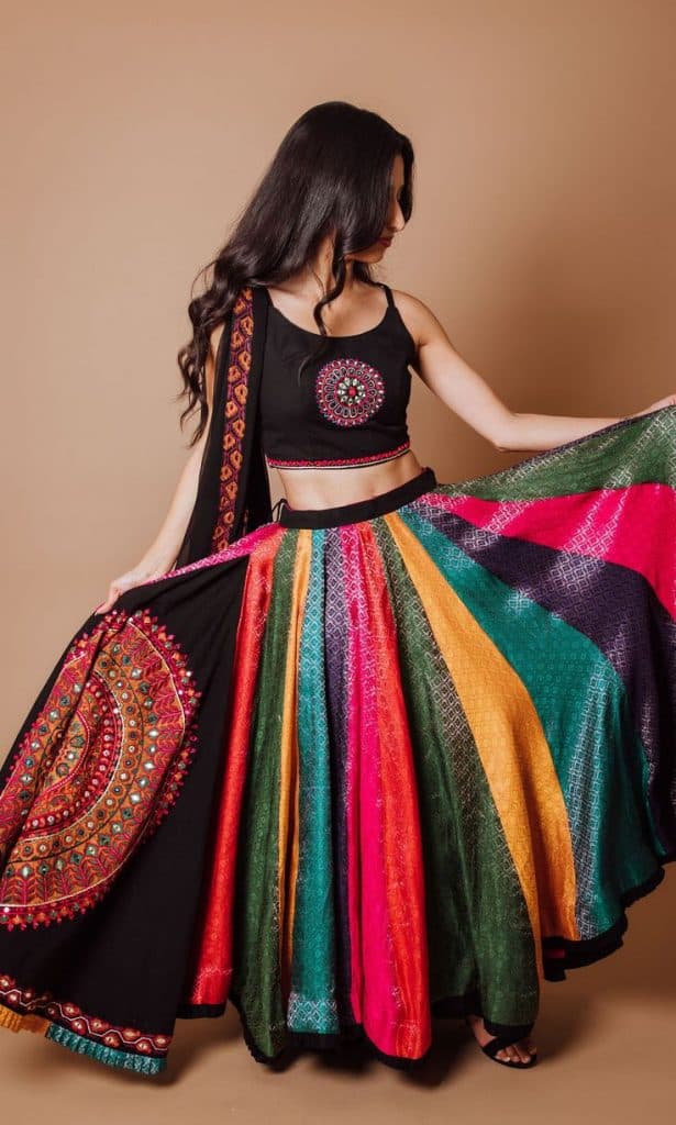 लेयर्ड चनिया का डिज़ाइन गरबा के लिए विशेष रूप से उपयुक्त है, यह फ्लेयर्ड लुक देती है, जिससे आप आसानी से नृत्य कर सकते हैं, आमतौर पर ये चनिया हल्के कपड़े में बनाई जाती हैं, जो नृत्य के दौरान आपको आरामदायक महसूस कराती हैं, विभिन्न लेयर्स के कारण यह चनिया चोली आपके हर मूवमेंट को खूबसूरती से दिखाती है.