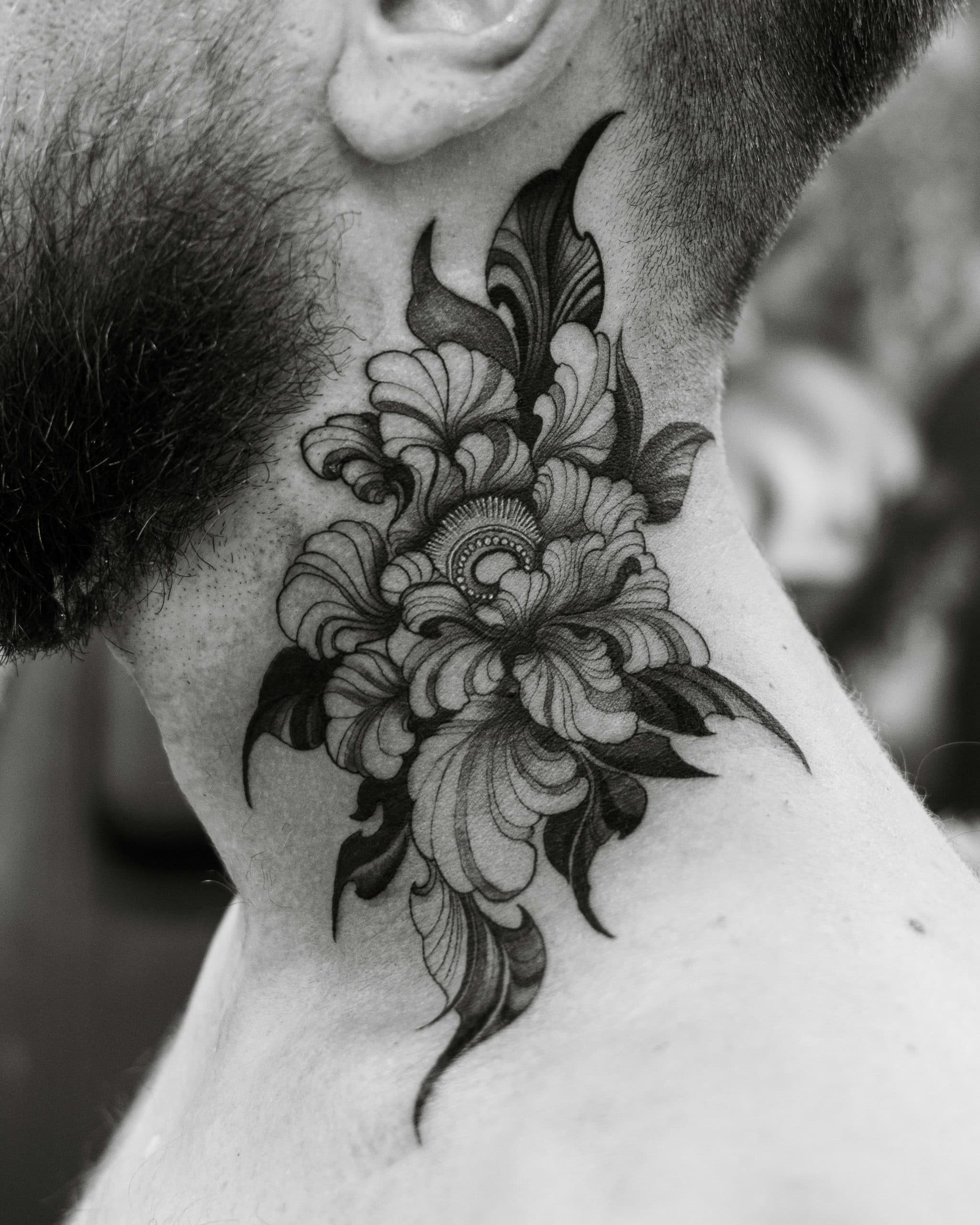 फ्लोरल टैटू डिज़ाइन गर्दन पर बहुत ही आकर्षक लगते हैं। आप सुंदर और नाजुक फूलों का डिज़ाइन चुन सकती हैं, जैसे गुलाब, लिली, या चांदनी फूल. ये टैटू बहुत ही एलिगेंट और फैमिनिन होते हैं. अगर आप इसे साइड नेक पर बनवाती हैं, तो यह आपकी खूबसूरती को और निखारेगा.