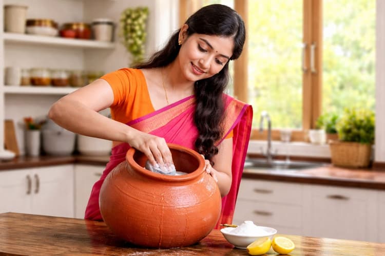 घड़े के अंदर 1 चम्मच बेकिंग सोडा या 1 नींबू का रस डालें. हल्के हाथ से अंदर रगड़ें और फिर साफ पानी से धो लें. इससे घड़ा बिल्कुल ताज़ा और साफ हो जाता है.