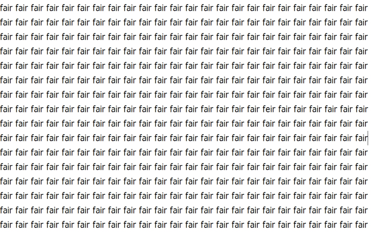 आज हम आपके लिए जो पहेली लेकर आए हैं वो एक बहुत ही दिलचस्प तस्वीर के रूप में है. इस तस्वीर में आपको कई शब्द दिख रहे होंगे. तस्वीर में Fair शब्द कई बार लिखे दिख रहे होंगे, लेकिन इन्हीं शब्दों के बीच कहीं पर Feir लिखा है. आपको करना बस इतना सा काम है कि 12 सेकेंड के अंदर Feir शब्द को ढूंढकर निकालना है.