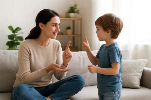 प्रतिक्रिया दें: जब बच्चा कुछ इशारा करे, तो उसकी प्रतिक्रिया दें ताकि वह समझे कि आप उसकी बात समझ रहे हैं।