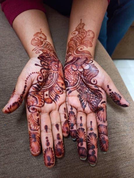 अगर आपको मेहंदी लगाना पसंद है और आपके पास इस काम के लिए पर्याप्त समय है, तो आप मोर डिजाइन वाली फुल हैन्ड की मेहंदी लगा सकती हैं. ये डिजाइन भले ही लगाने में थोड़ा मुश्किल है और ज्यादा समय भी लेता है, लेकिन इसकी सुंदरता इतनी होती है कि लोग इसे लगाना बहुत पसंद करते हैं. इस मेहंदी की भव्यता और सुंदरता आसानी से लोगों का ध्यान अपनी ओर खींच लेती है.