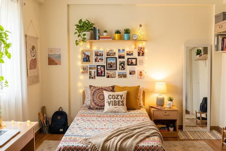 पोस्टर, फोटो फ्रेम या DIY वॉल आर्ट लगाएं. आप fairy lights भी लगा सकते हैं जिससे रूम में warm और cozy feel आए.