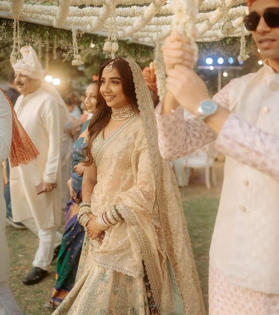 प्राजक्ता कोली ने अपनी शादी के लिए पेस्टल लहंगे को चुना है जिसमें हरे रंग का वर्क भी है. ओपन हेयर और मांग में टिके के साथ कोली बहुत ही प्यारी ब्राइड लग रही हैं.