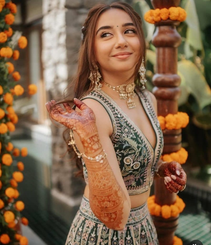 प्राजक्ता कोली ने दूसरे लुक में ग्रीन लहंगे में सुर्खियां बटोरी है. लहंगे के साथ हेवी ज्वेलरी और बिंदी में वह बला की खूबसूरत लग रही हैं. फैंस ने प्राजक्ता के इस लुक को बहुत प्यार दिया है. एक फैंस ने कमेंट में लिखा है की आप सबसे प्यारी होने वाली ब्राइड लग रही हैं.