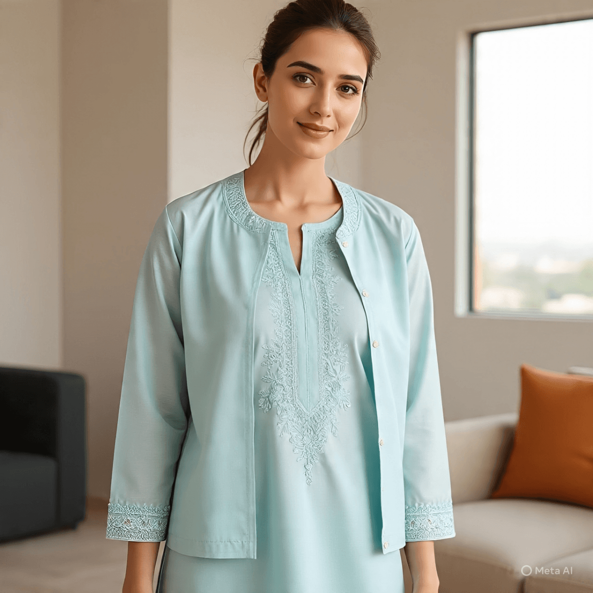 अगर आप सिंपल लेकिन स्टाइलिश लुक चाहती हैं, तो कुर्ती के ऊपर एथनिक जैकेट वाला सेट ट्राय करें. यह मॉडर्न और ट्रेडिशनल का बेहतरीन मिक्स है. साथ ही कॉटन फैब्रिक की वजह से यह बेहद कंफर्टेबल भी रहता है.
