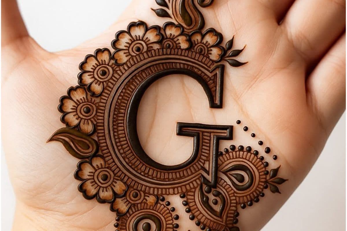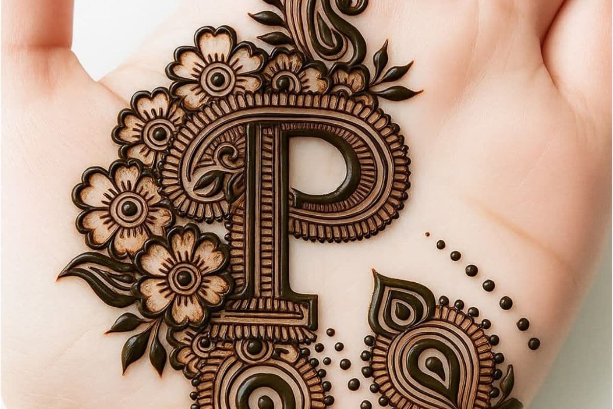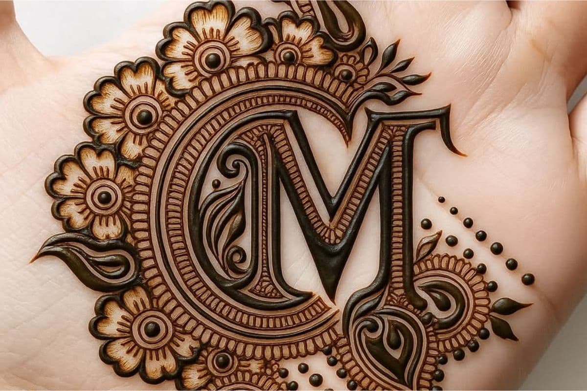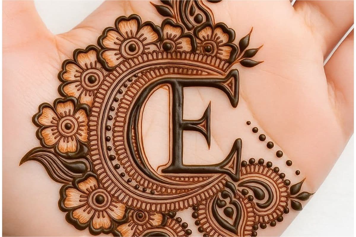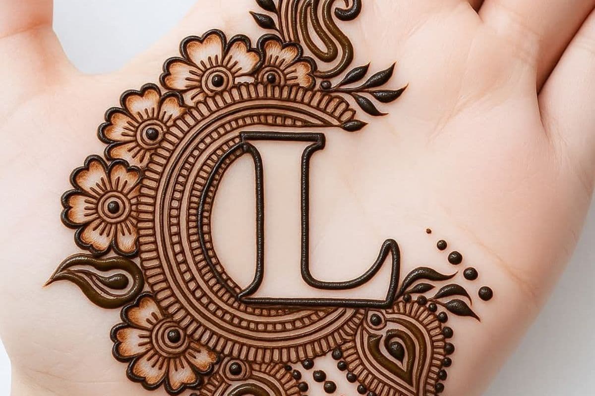 केंद्रीय डिजाइन: अक्षर को हथेली या हाथ के पिछले हिस्से पर एक गोलाकार मंडला, एक बड़े फूल, या एक ज्यामितीय पैटर्न के केंद्र में रखें. यह इसे एक मुख्य आकर्षण बनाता है.