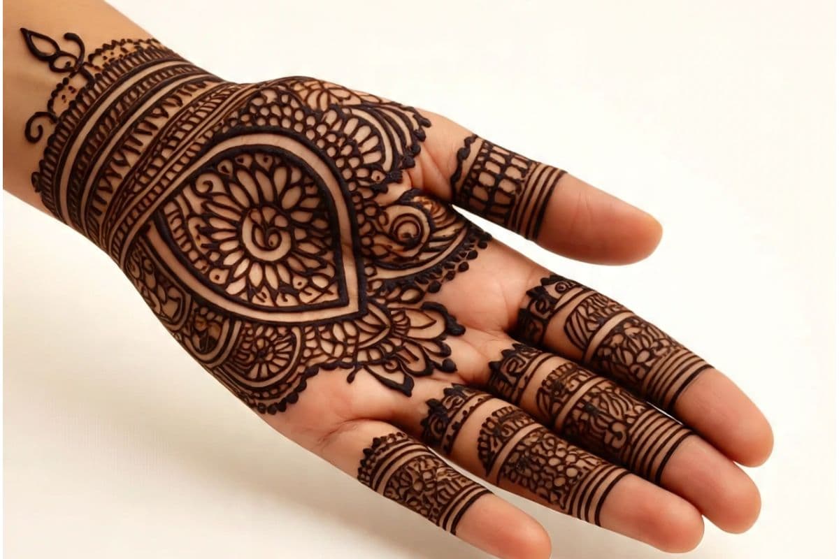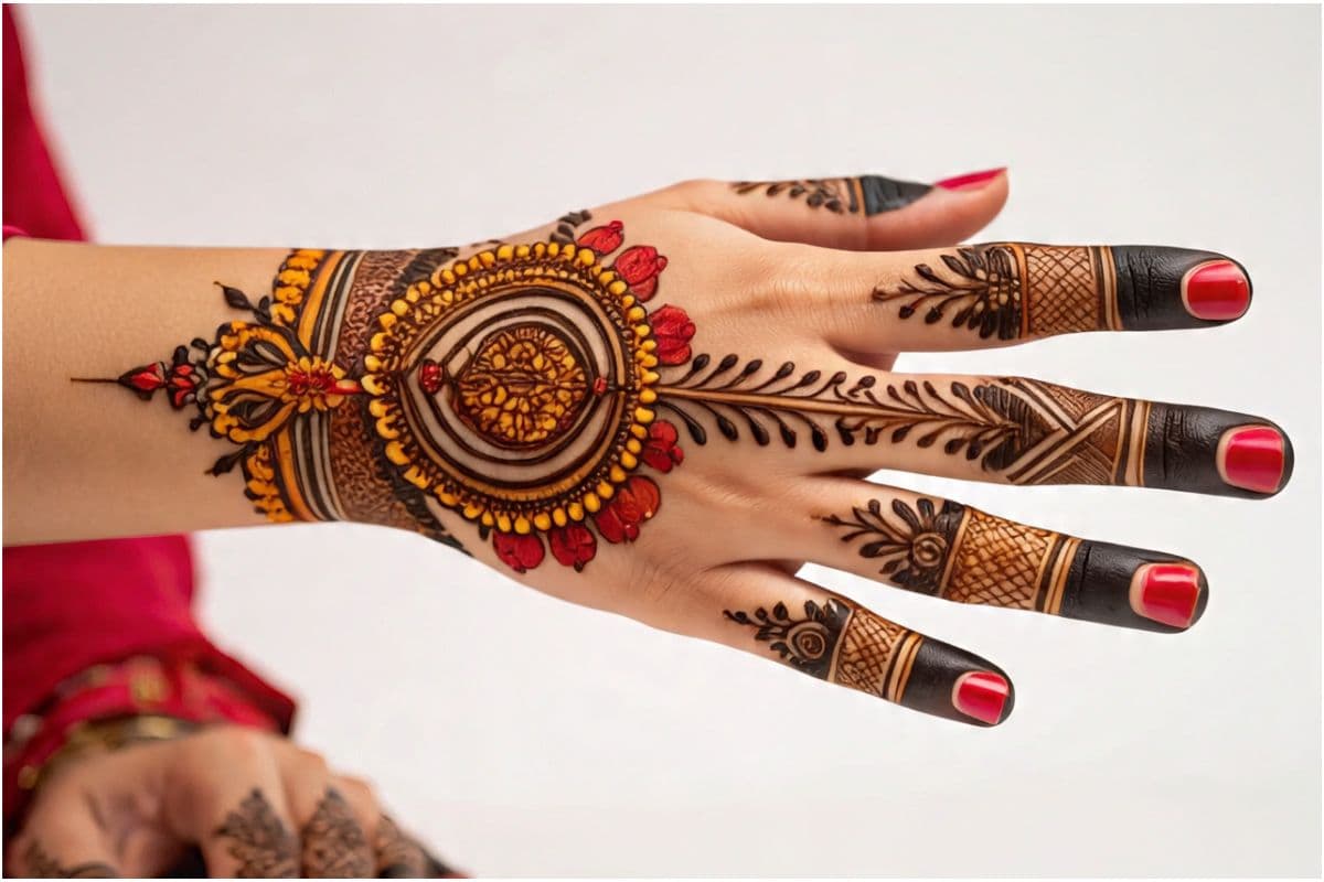 सिंपल सर्कल डिजाइन: यह डिजाइन बनाना बहुत ही आसान है. आप हथेली के बीच में एक बड़ा सर्कल या सूरज जैसा पैटर्न बना सकती हैं और उसके चारों ओर छोटी-छोटी बिंदियां लगा सकती हैं.