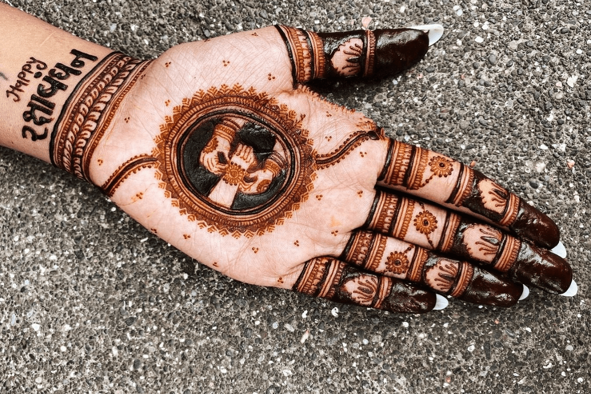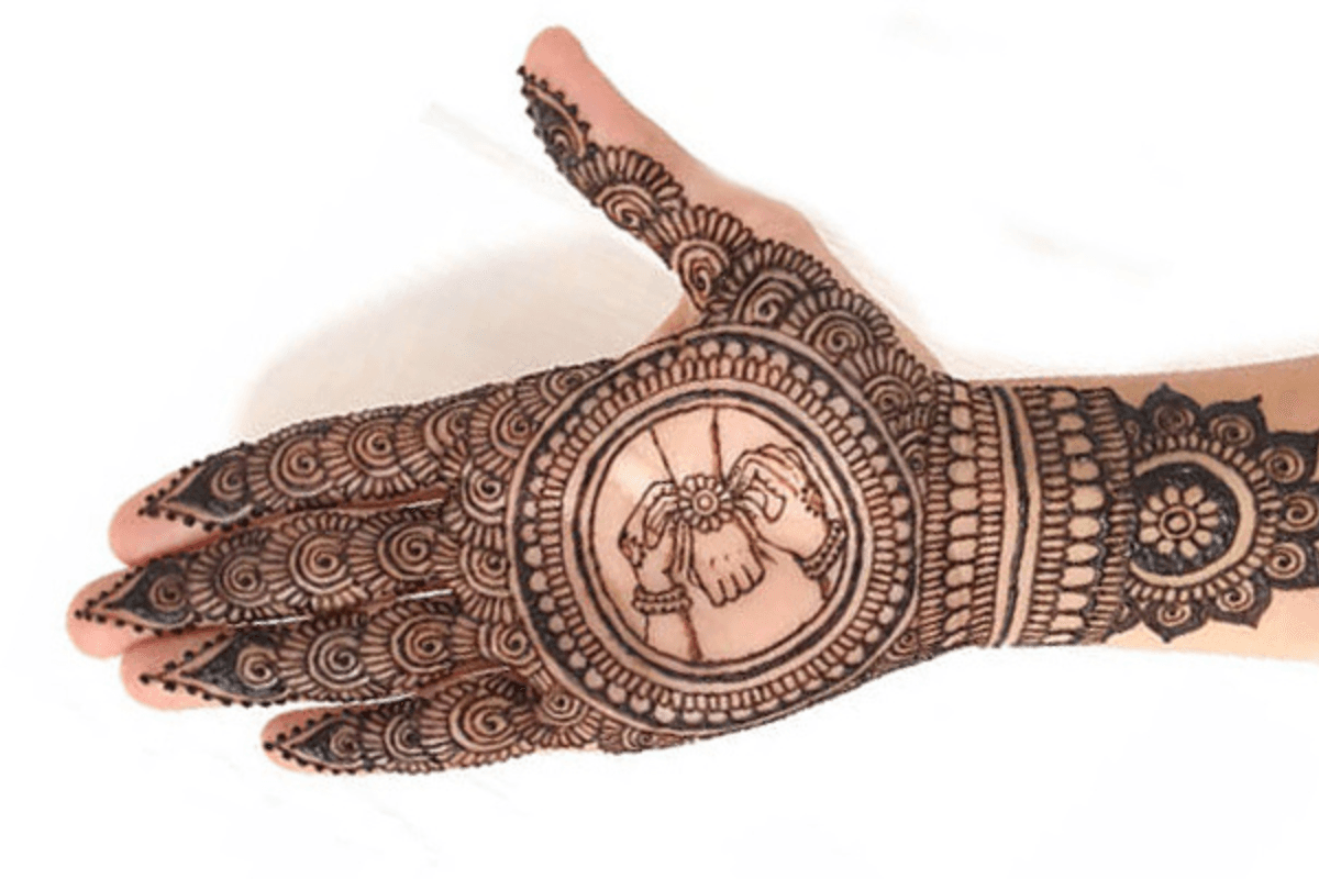 इस मेहंदी में राखी की शेप और पैटर्न को बहुत सुंदर तरीके से रचा गया है. हाथों पर बनी राखी की आकृति देखने में बिलकुल असली राखी जैसी लगती है. रक्षाबंधन पर ऐसा खास डिजाइन सबका ध्यान खींचता है.