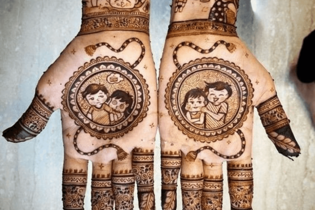 यह मेहंदी डिजाइन राखी बांधने के खास पल को दिखाता है. इसमें भाई-बहन का प्यार बहुत सुंदर तरीके से रचा गया है. यह डिजाइन देखने में भी बहुत प्यारा लगता है. रक्षाबंधन पर हाथों में ऐसा पैटर्न त्योहार को और भी खास बना देता है.