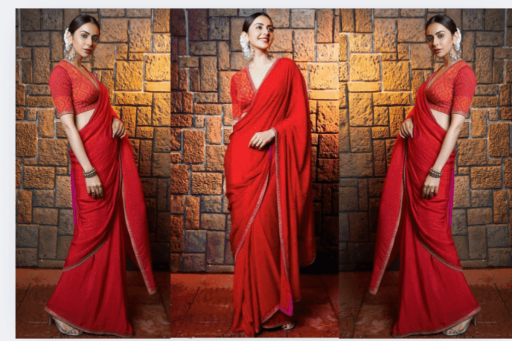 1. Rakul Preet Elegant Red Saree Look – सिंपल रेड साड़ी में रॉयल एलीगेंस