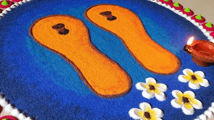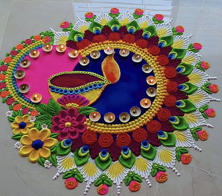 ये रंगोली जगह को आध्यात्मिक बनाने के लिए बनाई जाती है. इसके लिए “ॐ” को सेंटर पर रखकर चारों दिशाओं में स्वस्तिक, दीपक, कमल बनाए जाते हैं.