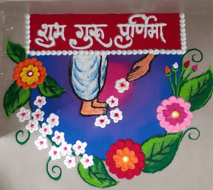 इसके लिए गोल या चौकोर रंगोली के चारों ओर दीयों की चित्र बनाई जाती है. फिर बीच में “गुरु पूर्णिमा” लिखा जाता है. खासकर यह डिजाइन रात के समय में बेहद आकर्षक लगता है.