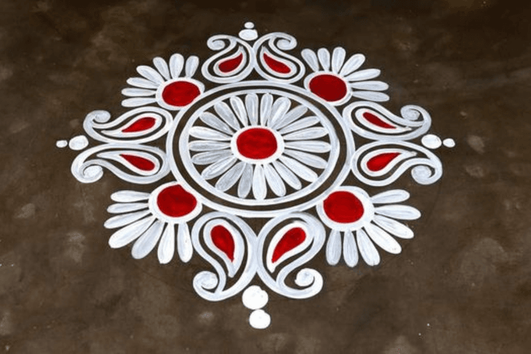 फ्लोरल मोटिफ हमेशा ही रंगोली में चार चांद लगाता है. इसके लिए आपको बस सफेद और लाल या पीले रंग की जरूरत है. सफेद रंग से फूल के आकार में बेस बनाएं और बीच में दूसरे रंग से डॉट्स या लहरियां डालें. यह सिंपल लेकिन बेहद आकर्षक लगेगा और आपके आंगन की शोभा बढ़ाएगा.