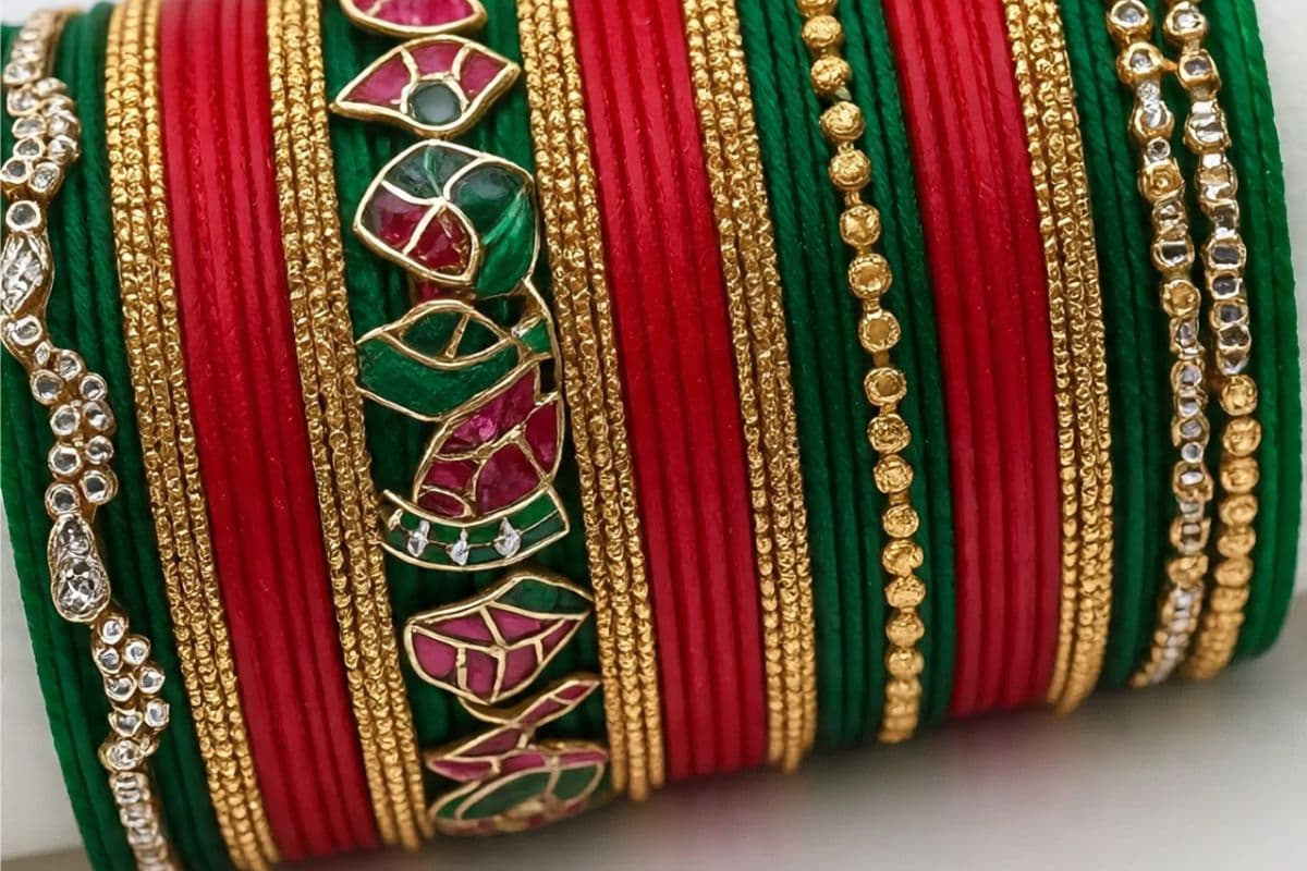 कुंदन वर्क चूड़ा डिजाइन : लाल और हरे चूड़े पर गोल्डन कुंदन की बारीक कारीगरी होती है.ब्राइडल लुक के लिए एकदम परफेक्ट और रॉयल फील देता है.