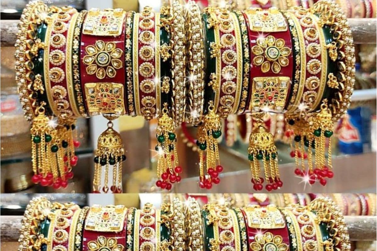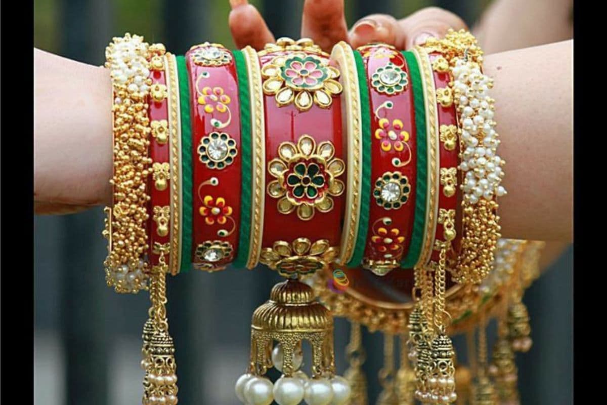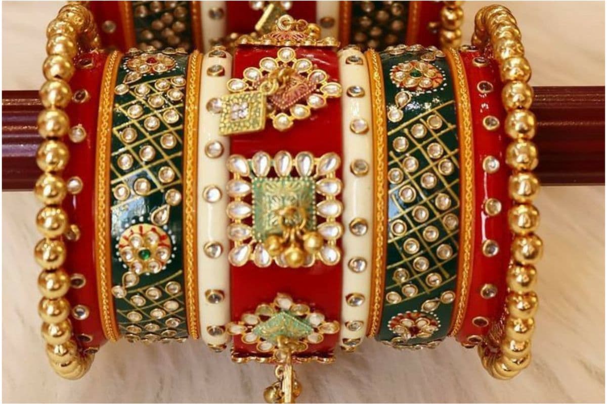 स्टोन स्टडेड चूड़ा : रेड और ग्रीन चूड़े पर चमकदार सफेद या गोल्डन स्टोन जड़े होते हैं.यह डिजाइन सिंपल साड़ी या लहंगे के साथ बहुत अच्छा लगता है.
