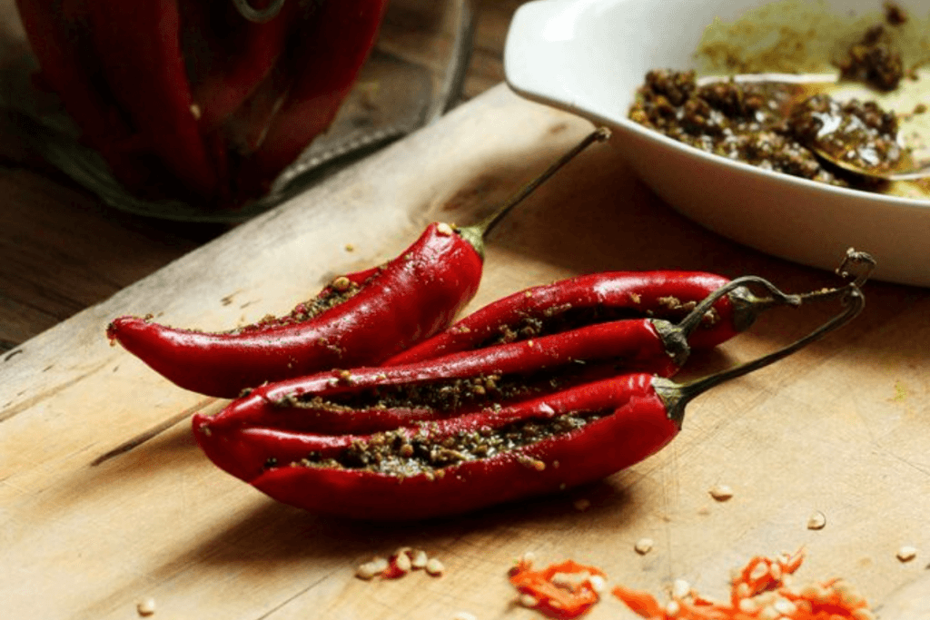 - लाल मिर्च को अच्छे से धोकर साफ करें और धूप में हल्का सुखा लें. फिर बीच में एक कट लगाएं ताकि उसमें मसाला भर सके.