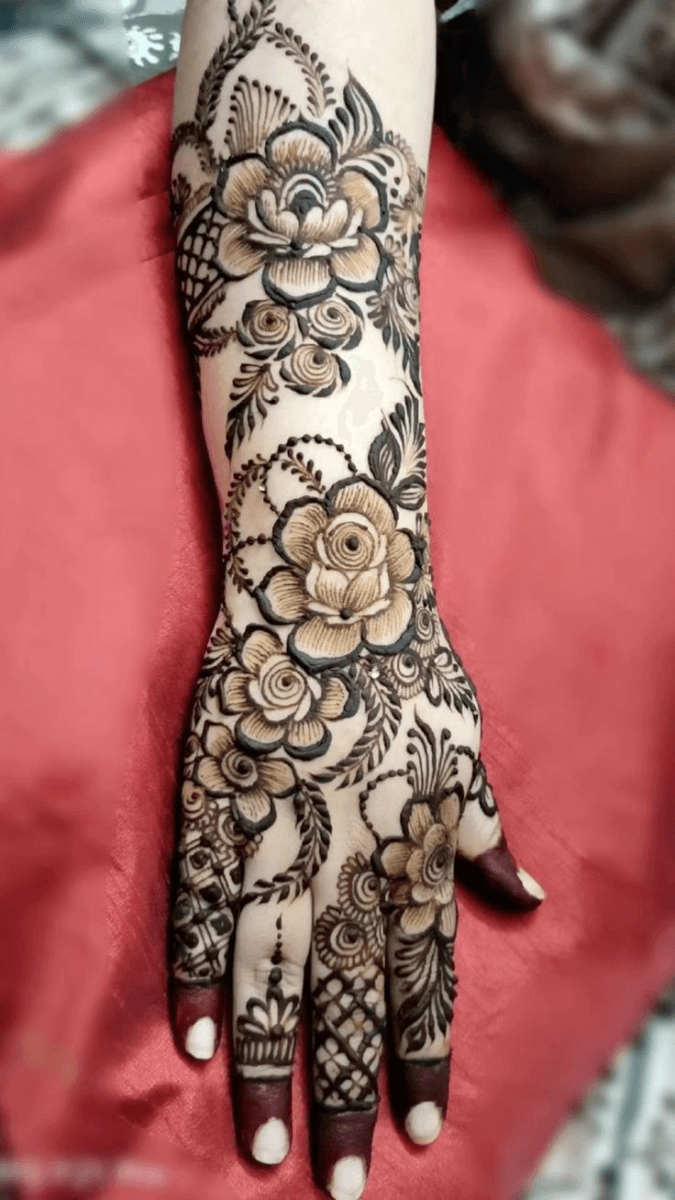 जब परंपरागत बेल में जुड़ जाए 3D आर्ट का तड़का, तो डिजाइन में एक नया आयाम आ जाता है. हथेली से उंगलियों तक जाती गहराई वाली बेलें शैडो और थ्री‑लेयर कटिंग से बनी डिटेलिंग देखने में हाइली आर्टिस्टिक और मॉडर्न लगती है. ये स्टाइल उन महिलाओं के लिए है जो मेहंदी में ट्रडिशन के साथ टेक्सचर की गहराई भी चाहती हैं.