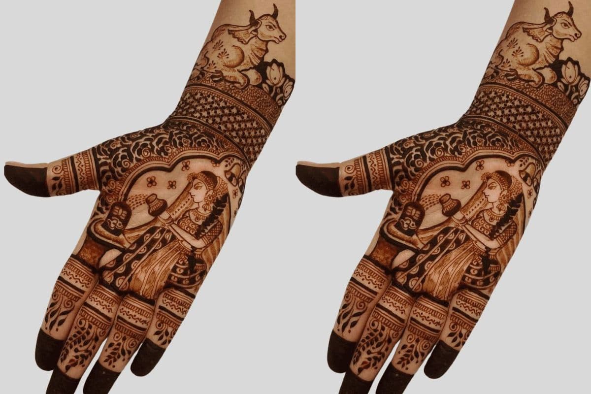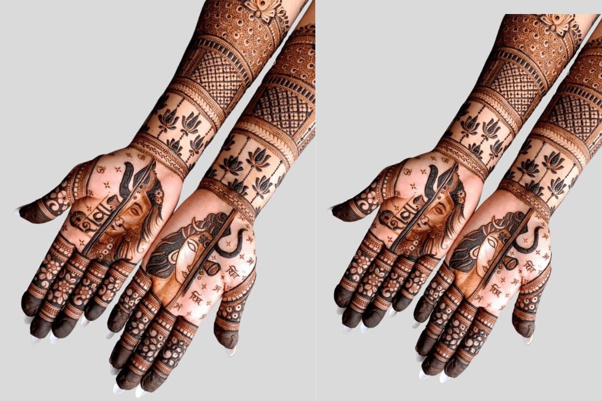 इस डिजाइन में दोनों हथेलियों पर आधे-आधे चेहरे बने हैं, एक तरफ भगवान शिव और दूसरी तरफ देवी पार्वती. जब दोनों हथेलियां साथ आती हैं, तो ये “अर्धनारीश्वर” यानी कि भगवान शिव और देवी शक्ति का संयुक्त रूप बनता है.