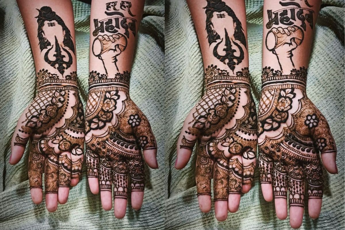हाथों पर भगवान शिव की छवि, जटाएं, त्रिशूल, डमरू और हर हर महादेव लिखा गया है. यह मेहंदी डिजाइन शिव भक्ति और आस्था का प्रतीक है.साथ ही हथेली के निचले हिस्से में फ्लोरल, बेल-पैटर्न और जाल डिजाइन है, जो उसे एक ट्रेडिशनल टच देता है.