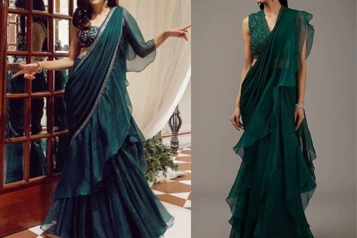 अगर आप मॉडर्न और फ्यूजन लुक चाहती हैं तो रफल स्टाइल की साड़ी पहनकर आप सबसे अलग दिख सकती हैं. बेल्ट और स्लीवलेस ब्लाउज के साथ यह लुक और भी खास हो जाता है.