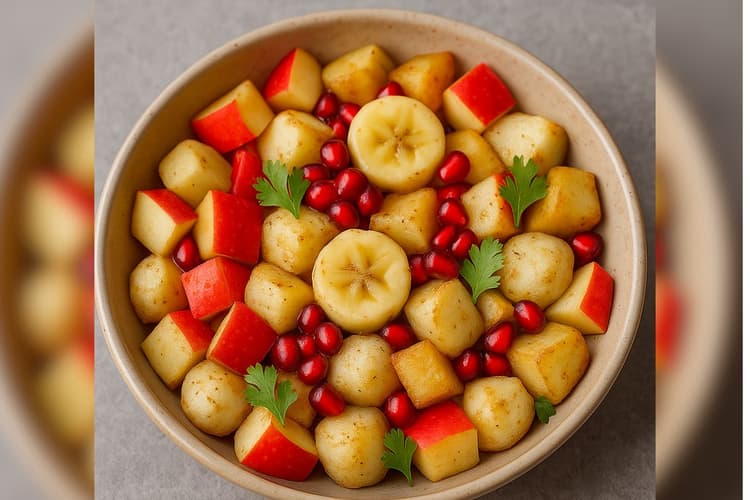 - फलाहारी चाट बनाने के लिए सबसे पहले एक बाउल में आलू, केला, सेब और अनार डालें.
