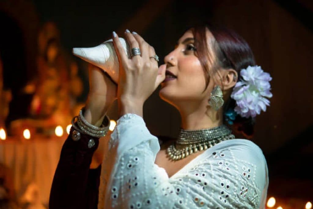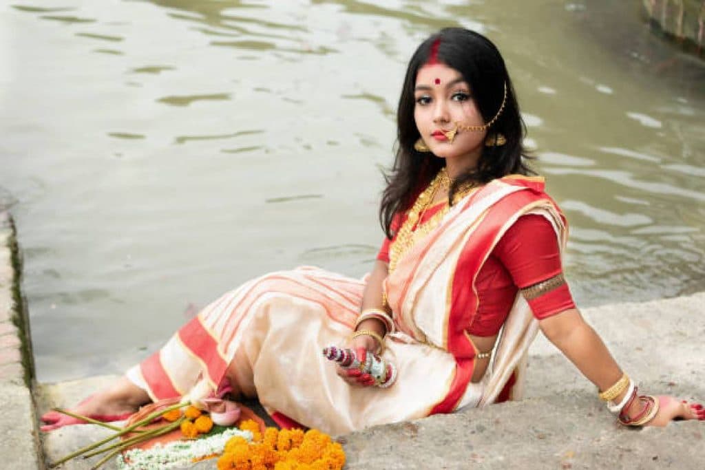 आप चाहें तो दुर्गा पूजा के दौरान पारंपरिक बंगाली स्टाइल में साड़ी पहन सकती हैं. ऐसी साड़ी के साथ हाथों में मेहंदी और पैरों में आलता लगाएं. इसके साथ ही गले में ज्वेलरी और हाथों में चूड़ियां पहनकर आप अपने लुक को पूरा कर सकती हैं.