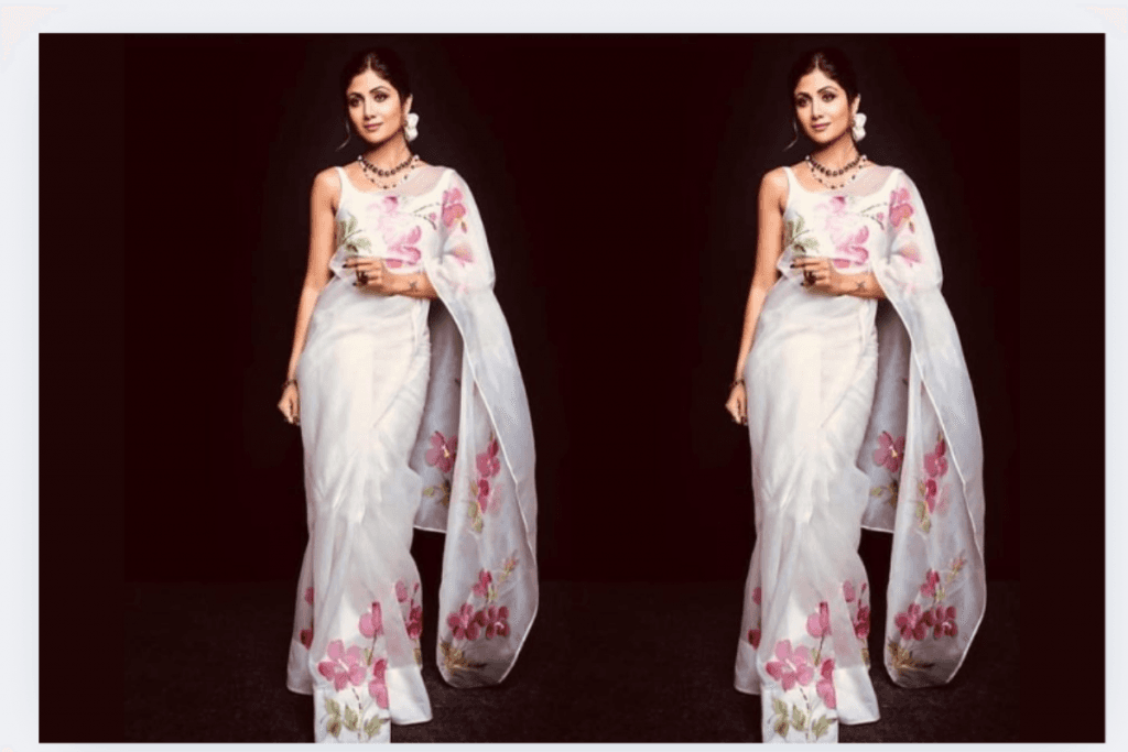 1. शिल्पा शेट्टी नेट साड़ी – ग्लैमरस और ग्रेसफुल लुक