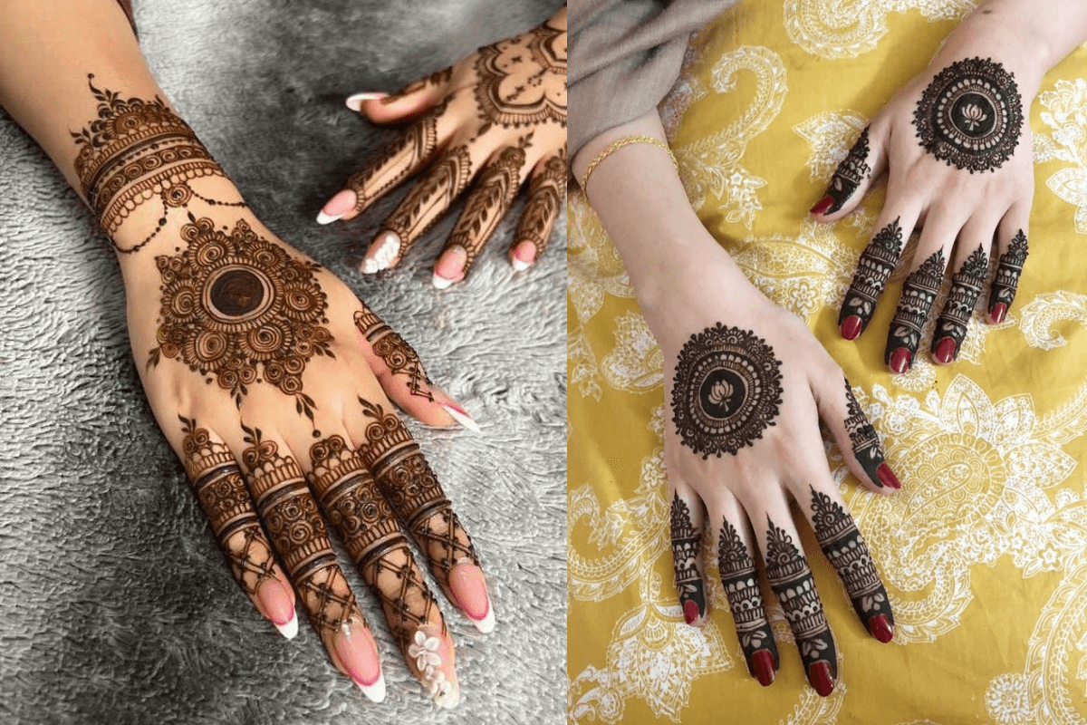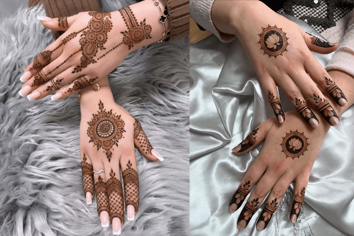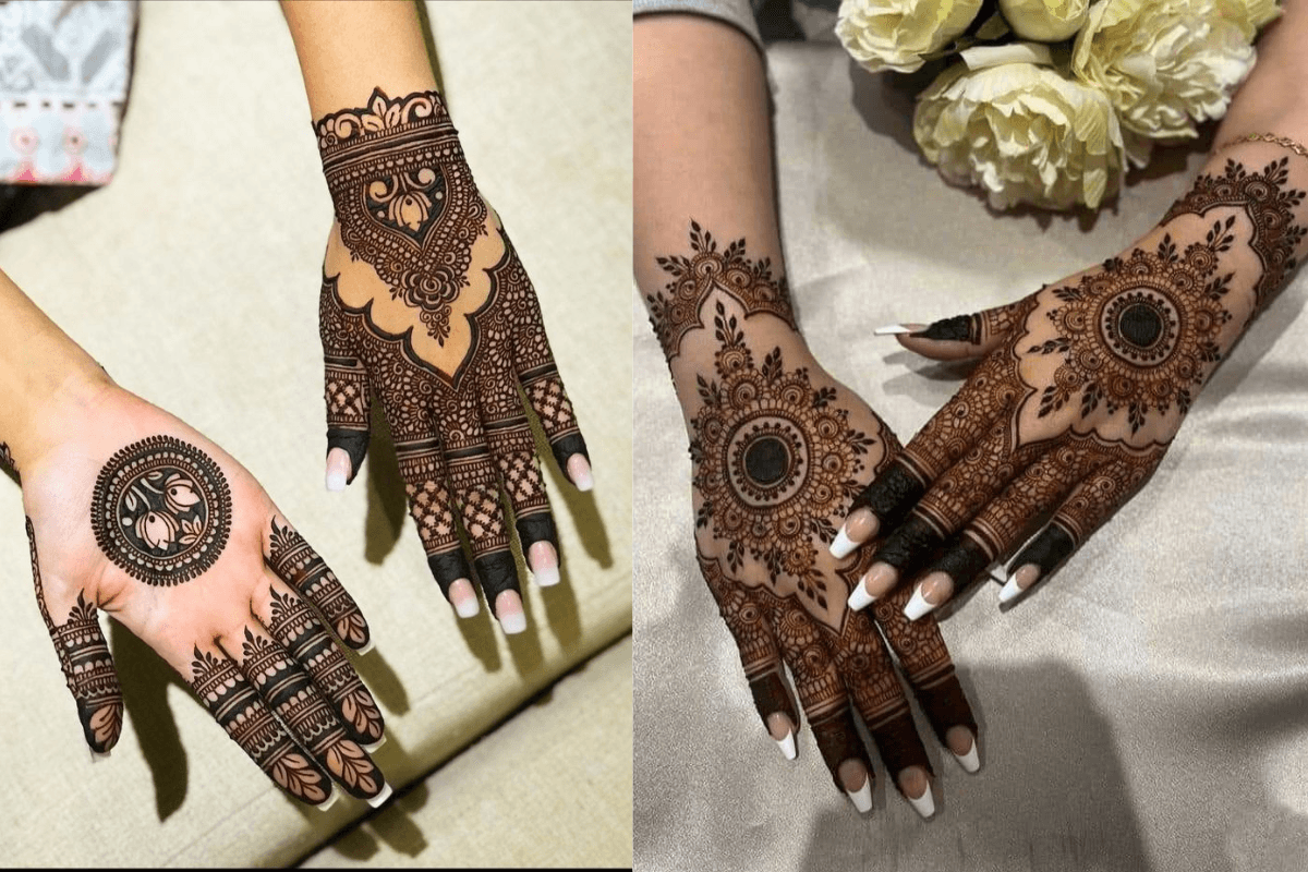 बैक हैंड पर डिजाइन बनाने का क्रेज इन दिनों बहुत ज्यादा है. इसमें अंगुलियों पर बारीक बेल और बीच में गोल या फ्लोरल मोटिफ्स बनते हैं, जो हाथों को स्लिम और सुंदर लुक देते हैं.